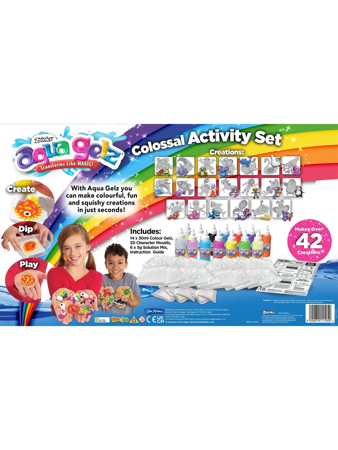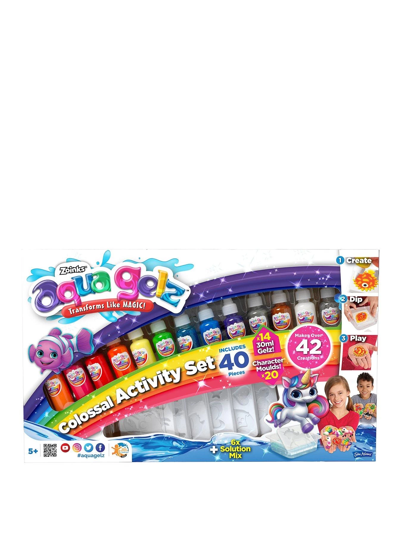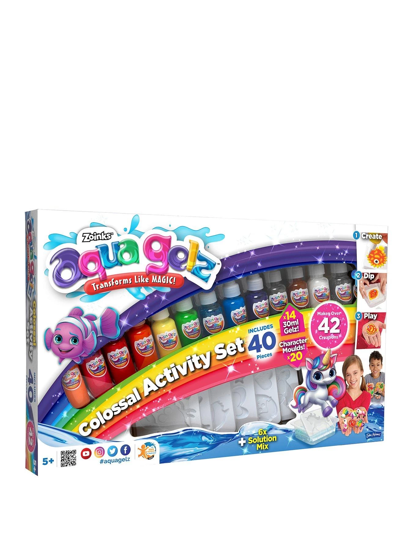 Aqua Gelz are magical liquid that transforms into colourful, fun, squishy creations. Mix the special powder with water. Squeeze the Aqua Gelz into the supplied moulds, then place them into the solution tank and watch as it sets in seconds. In the Aqua Gelz Colossal Activity Set there are 14 different gel colours to make over 42 Aqua Gelz creations.