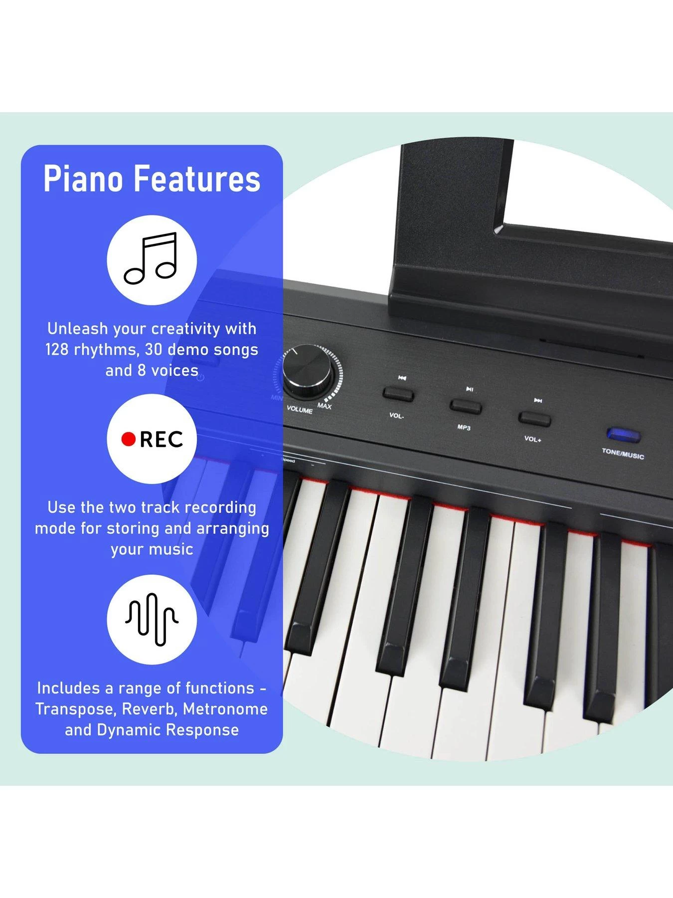 This piano is perfect for performance or practice whether you are looking for a portable instrument (weighing under 12kgs) to take with you or if you are on a budget, seeking a realistic, natural-sounding piano.
