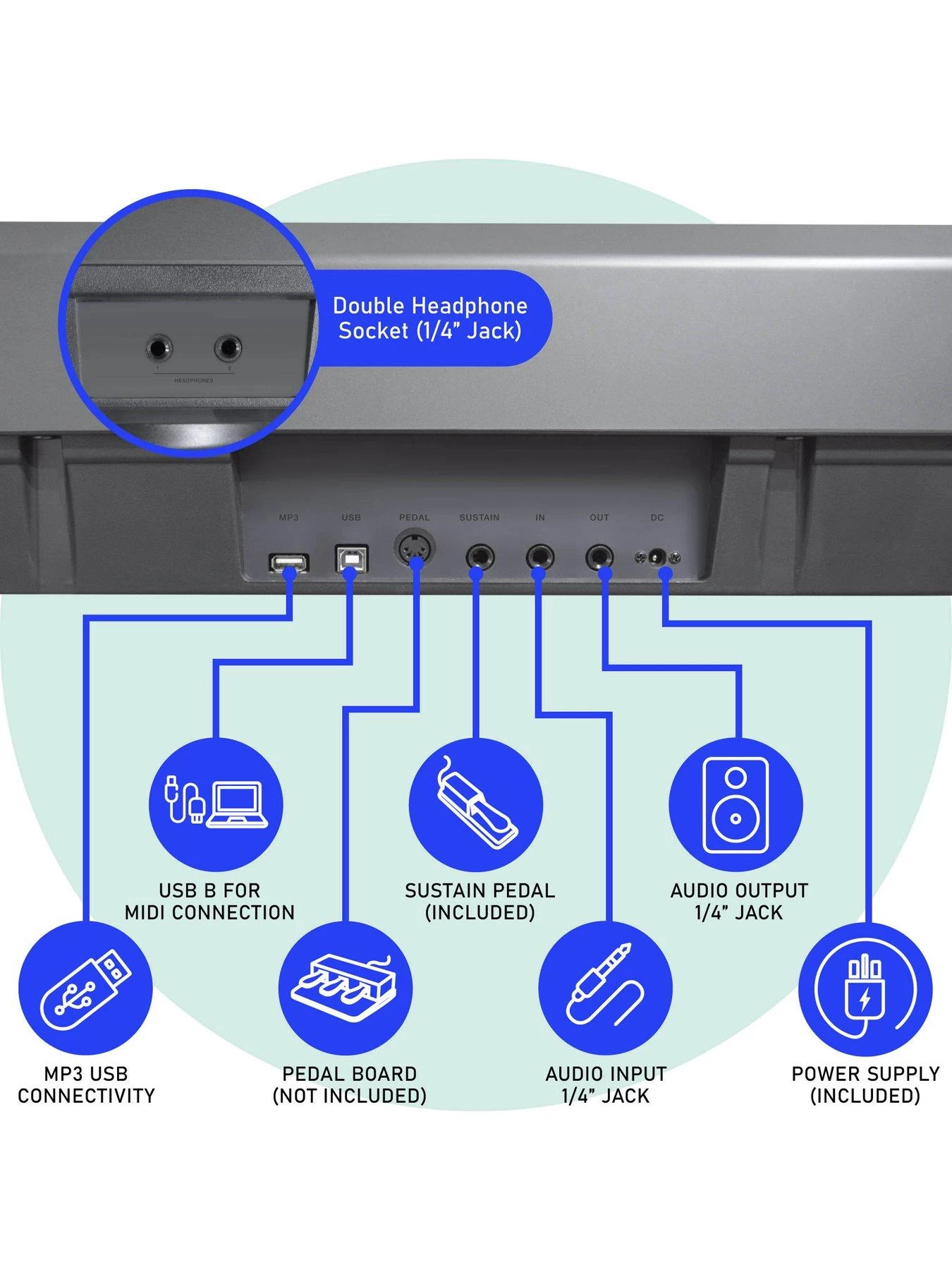 - Piano Style Sustain Pedal, Music Rest, Power Supply Included