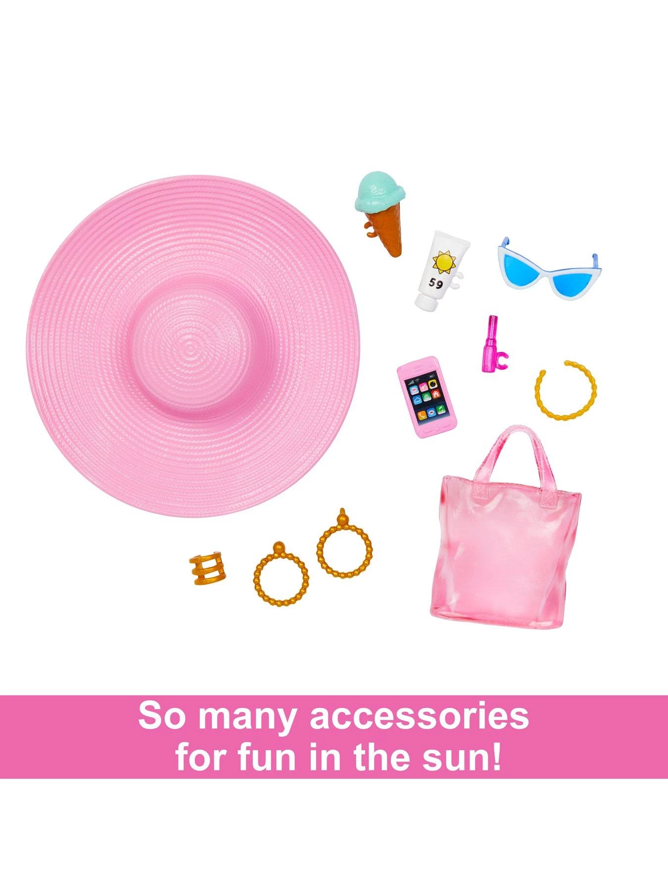 - Includes 1 Barbie doll with swimsuit, 1 pair of sandals, 1 sarong, 1 hat, 1 tote bag and assorted small accessories.