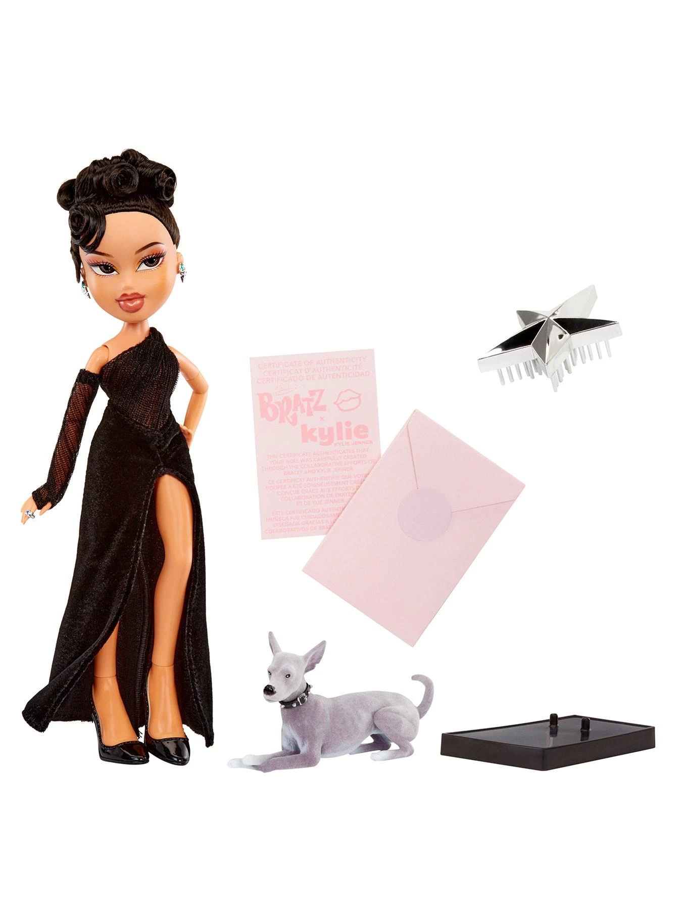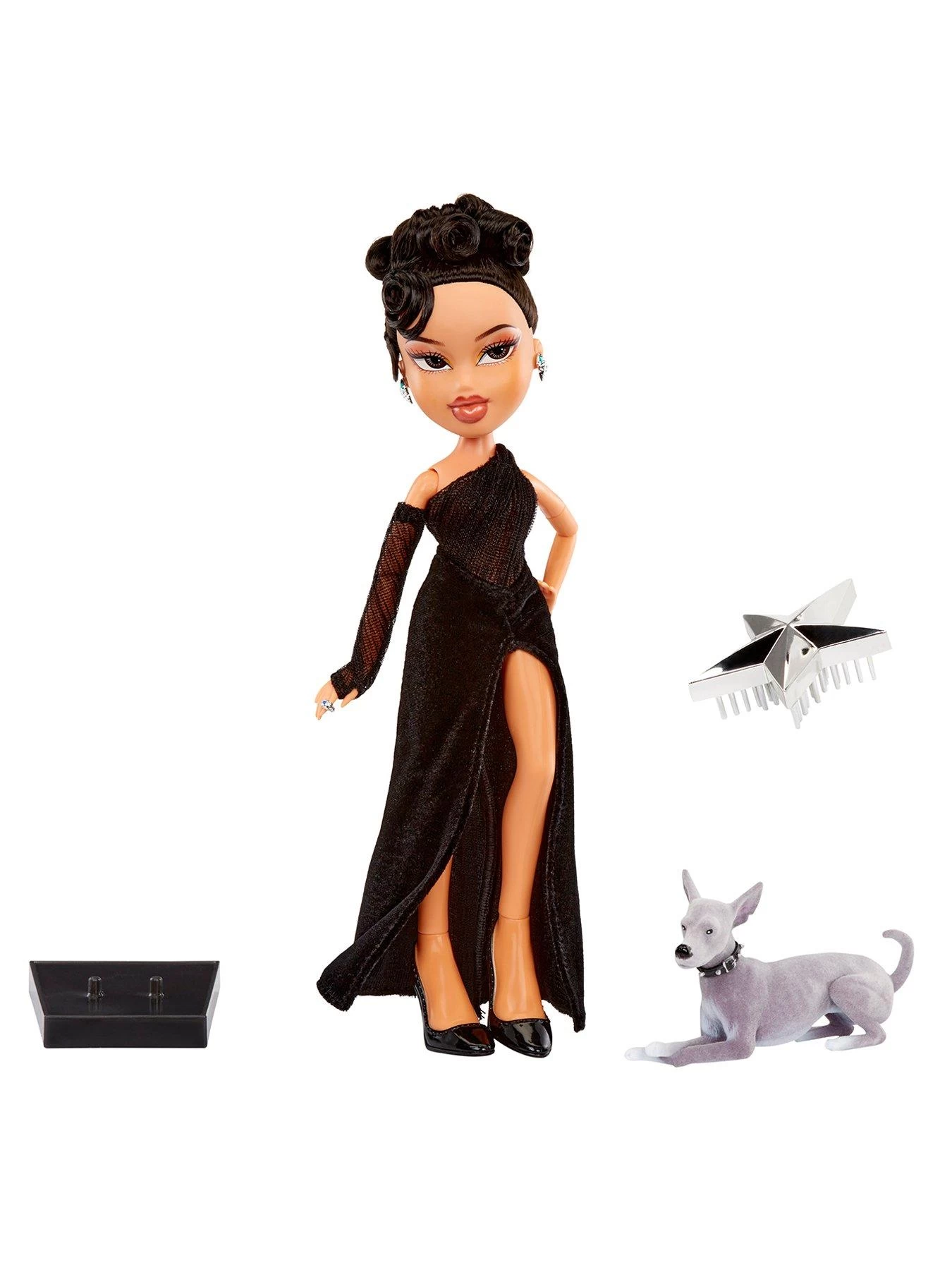 This Kylie Jenner Bratz doll sports a nighttime look wearing a vintage-inspired Hollywood glam textural one-shoulder, single-sleeve dress with an ultra-high slit. Her beloved Italian greyhound Norman has also joined her on her night out, sculpted in an elegant pose with flocked detailing and a studded collar.