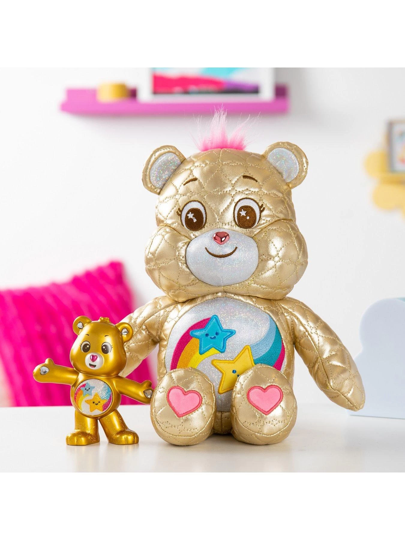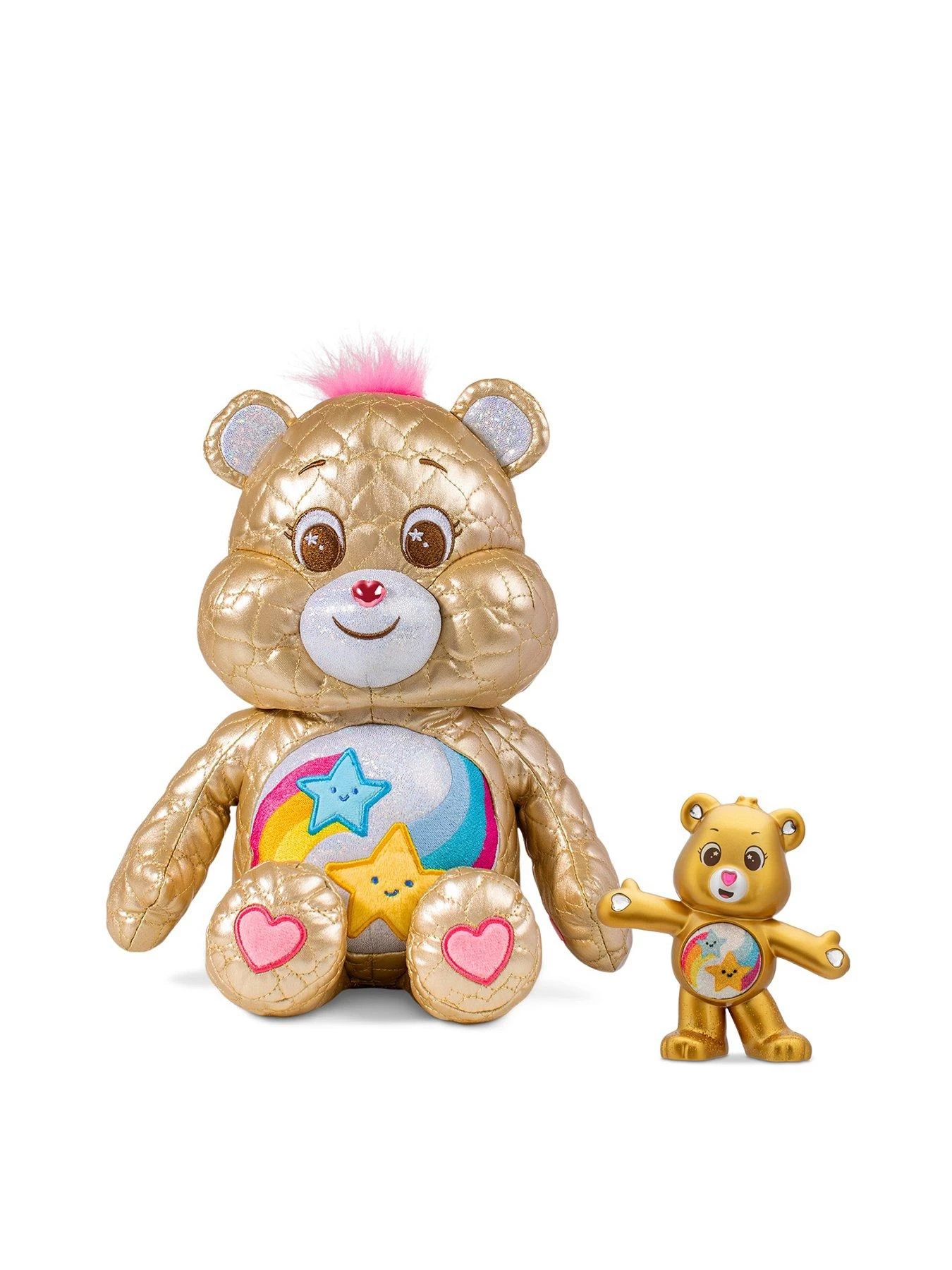 - The Dare to Care Bear 14-inch plush is featured in a beautiful golden fabric with heart-shaped quilted designs – simply gorgeous