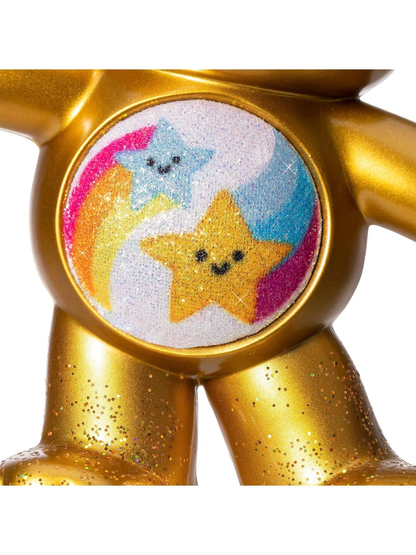 - Dare to Care Bear wears a unique and magical belly badge featuring two shooting stars with a sparkling silver background.