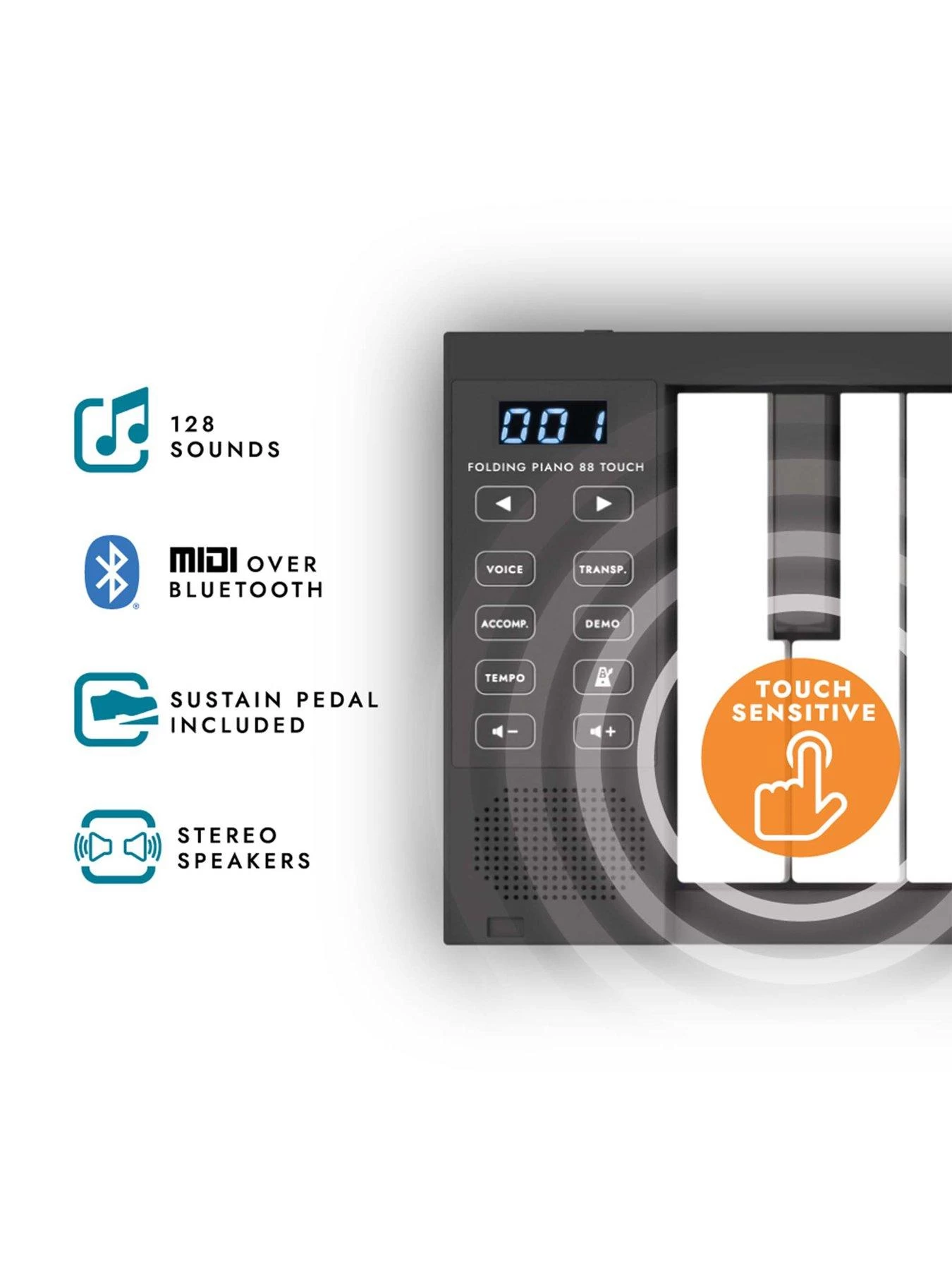 - A lightweight and compact design that unfolds into a full length 88-key piano