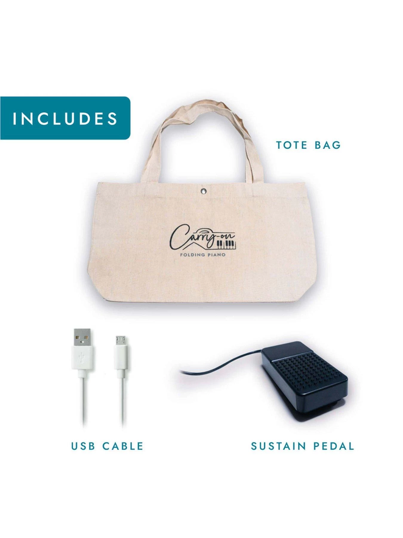 - Accessory List: Sustain Pedal, Tote Bag, USB Charging Cable