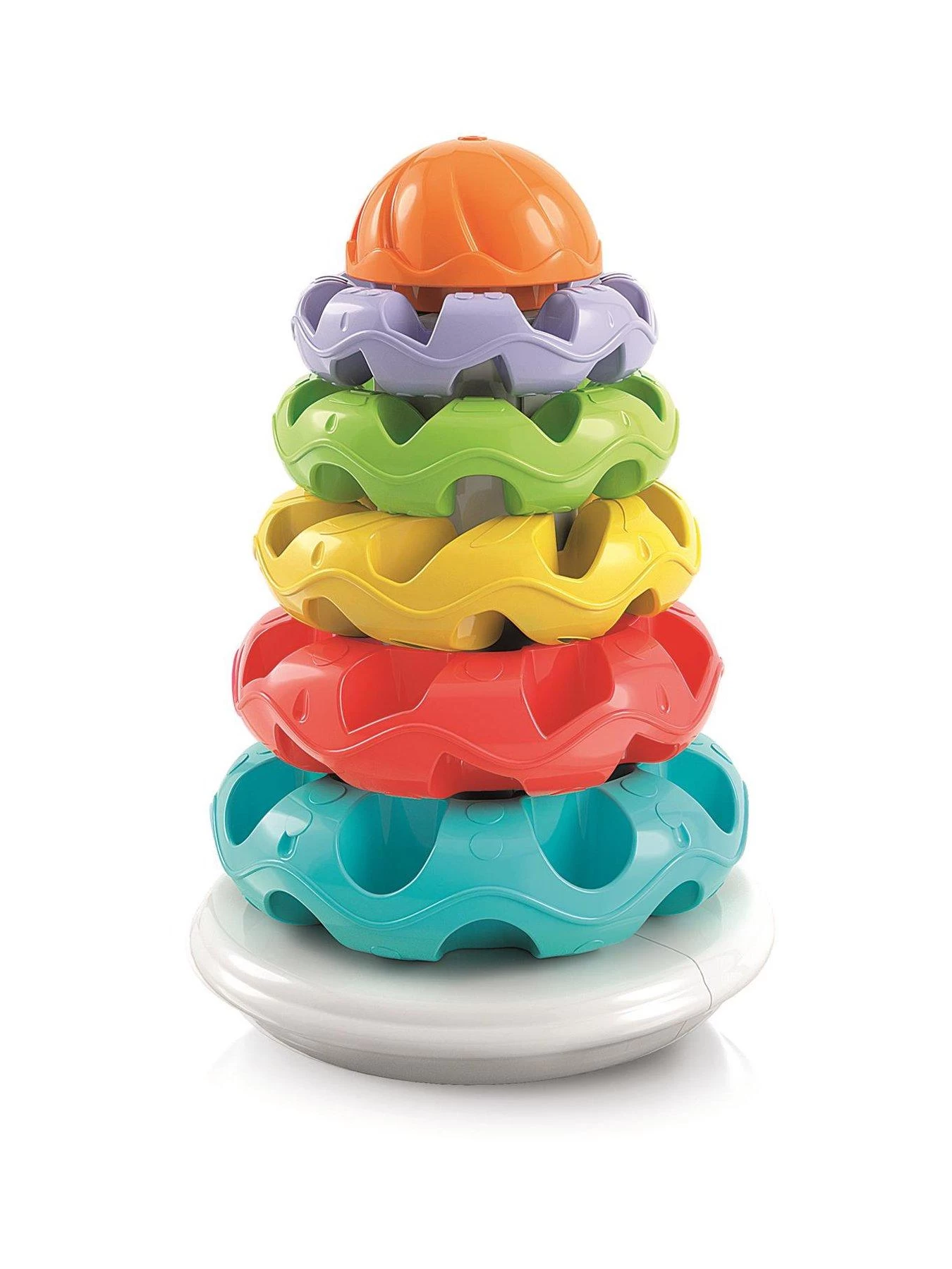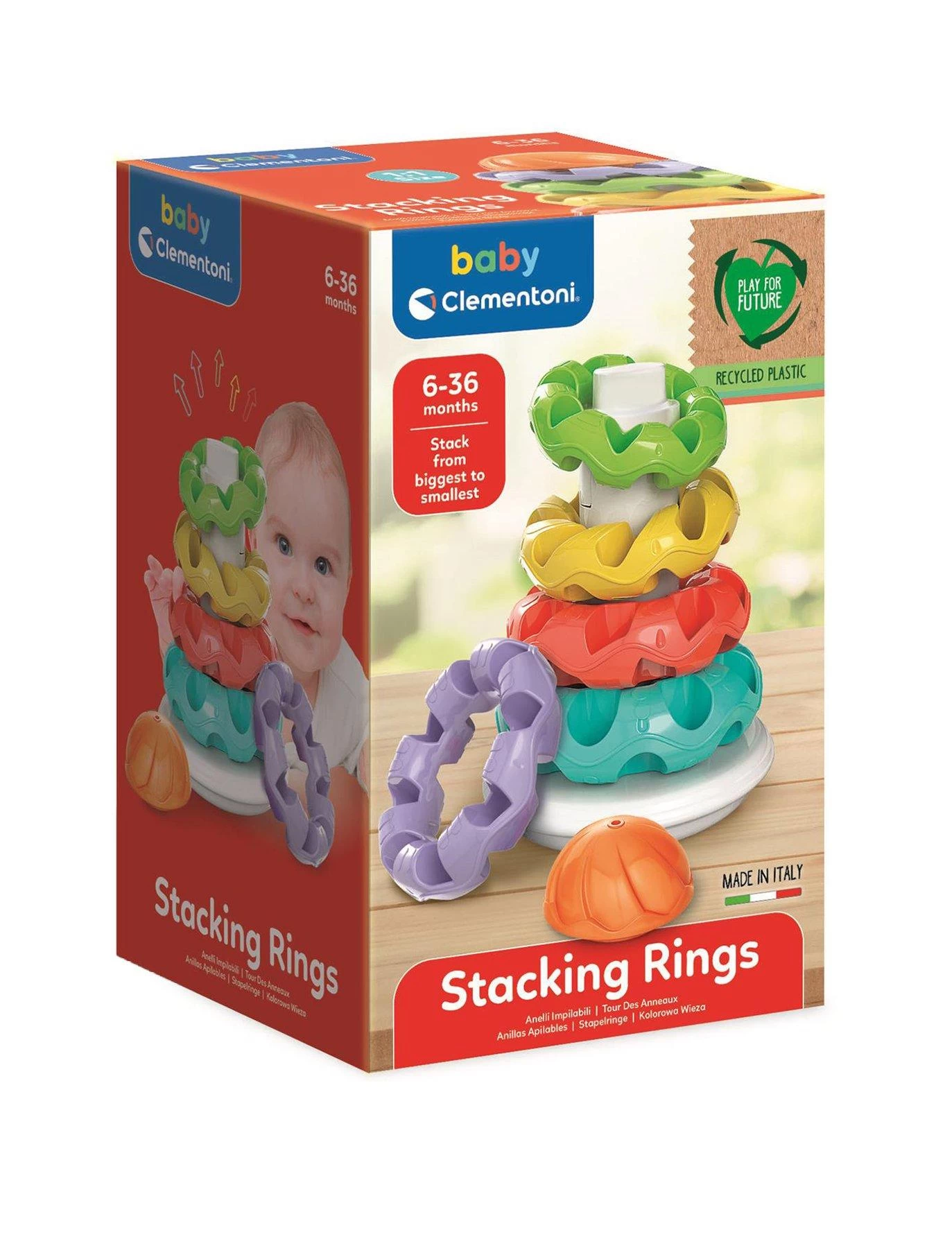 5 coloured rings of different sizes, to be stacked on a rocker base. The rings are made with different surfaces to stimulate the tactile perception of children. It supports the manual skills development and the visual perception. It stimulates the baby to recognise colours, shapes, sizes, cause and effect relations.