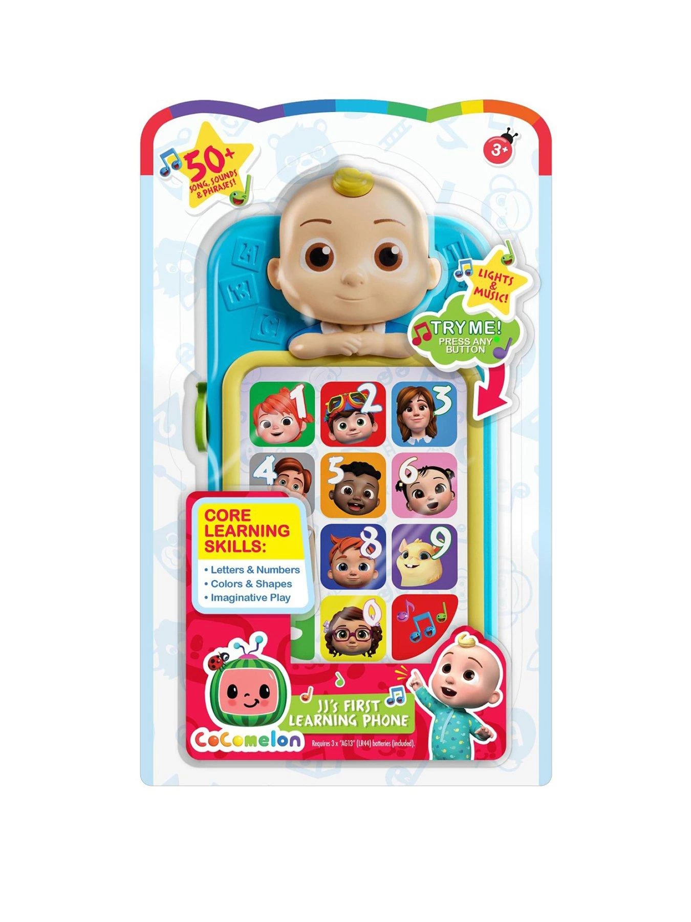 JJ is always on call to get little learners thinking with the CoComelon JJ’s First Learning Phone. Inspired by the hit educational YouTube Kids and Netflix series, CoComelon, this interactive toy phone allows children to engage in their own early learning adventures with JJ. Help spark your child’s creativity while discovering core learning and developmental skills through play. JJ’s First Learning Phone features buttons and over 50 different learning phrases, songs, and sounds to help teach letters, numbers, colors, shapes, weather, feelings, and so much more! The phone showcases an adorable, oversized JJ and depicts recognizable characters from the series on each of the buttons. The buttons even light up and the phone plays two popular songs to sing and dance along with, ‘The Wheels on the Bus’ and ‘BINGO’! This toy phone comes in a chunky design ideal for little hands. Children will love playing and learning with JJ whenever they go! Great for developing fine motor skills, encouraging reading and talking, cognitive learning, social emotional skills and creativity through imaginative play. Bring home the CoComelon JJ’s First Learning Phone as well as the rest of the CoComelon toys and block construction sets to help make your little learner Happy & Smart! Requires 3 x AG13 batteries (included).