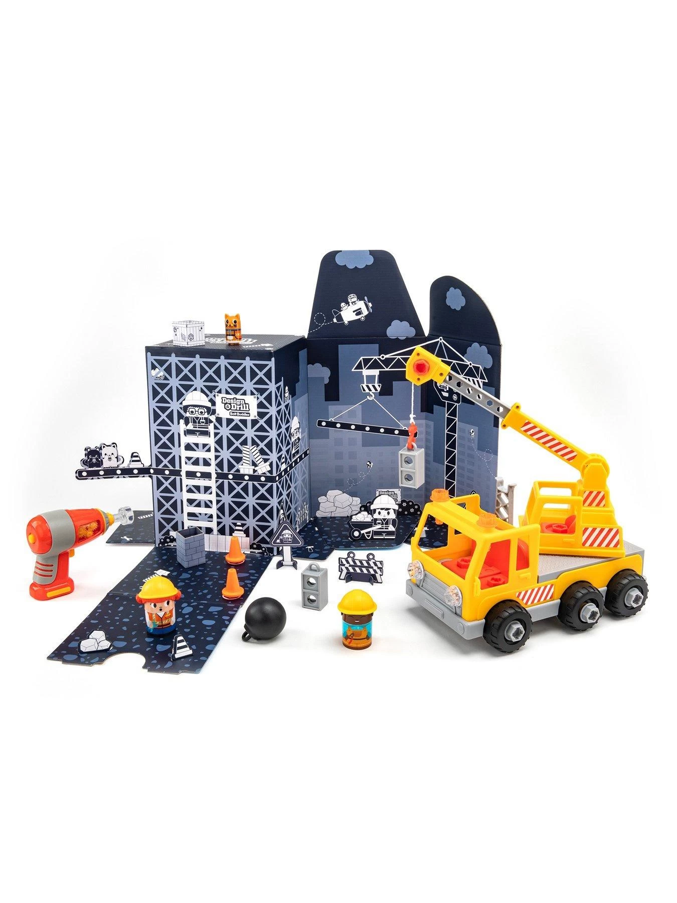 Children use a realistic working toy power drill and decorative bolts to build their own working crane with the Design & Drill Bolt Buddies Crane toy construction set. Then they drop in their Bolt Buddies construction workers and animal pal and enjoy imaginative play. The Bolt Buddies and animal pal double as tools that little builders can use to twist and turn the chunky bolts and build fine motor skills through fun play. Keep the FSC-certified packaging because it unfolds and transforms into a themed backdrop for increased imaginative play.