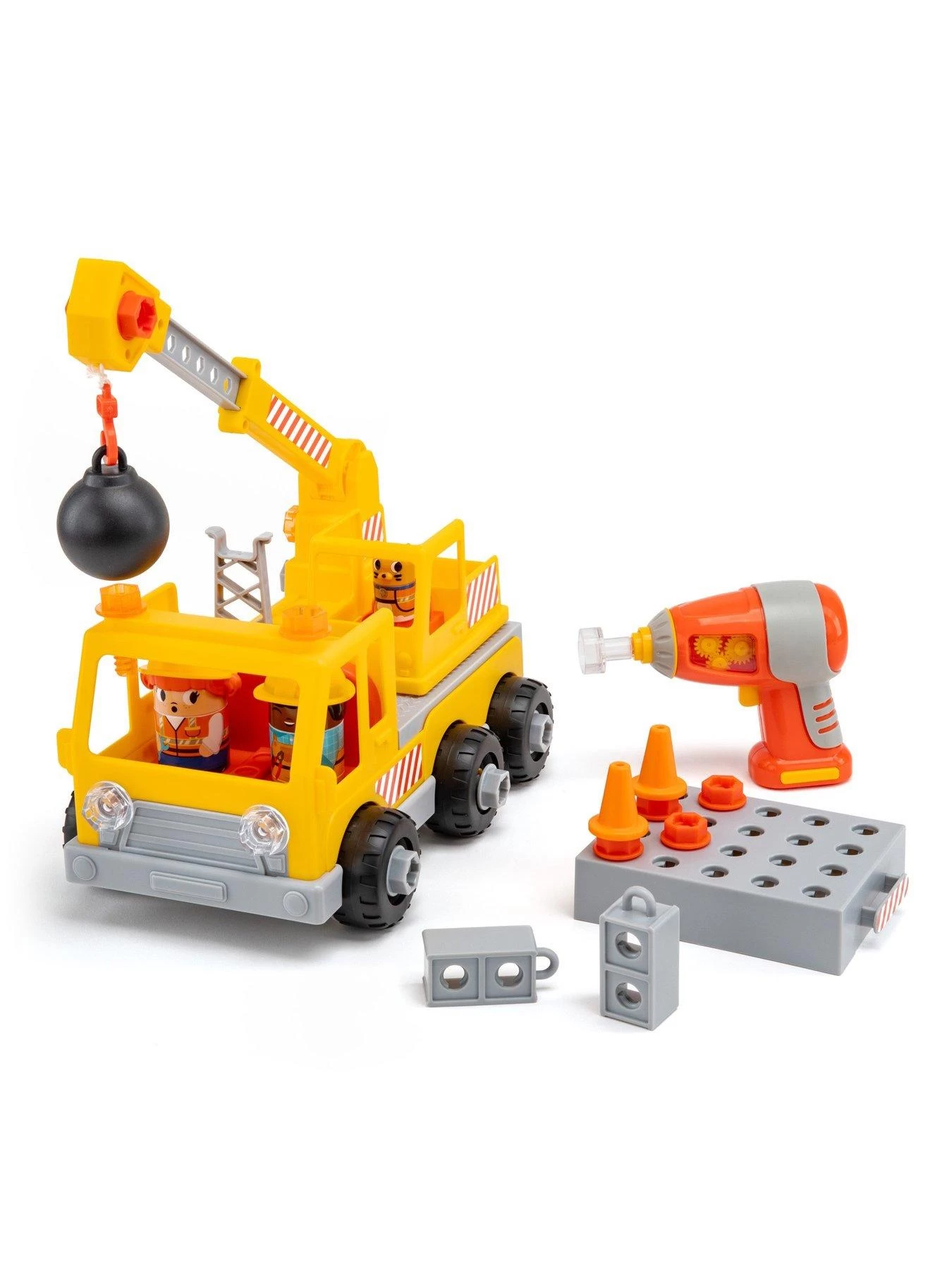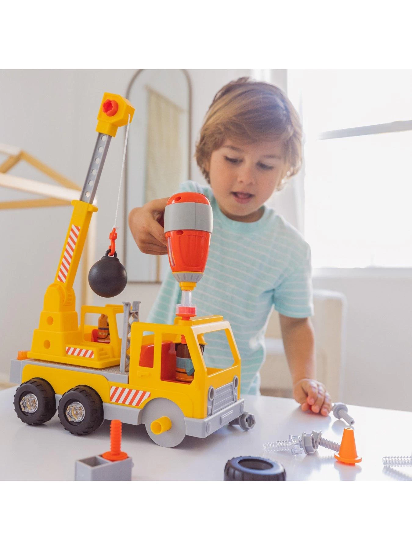 - Children use a real, working, kid-safe toy drill and colourful bolts to construct a working crane.