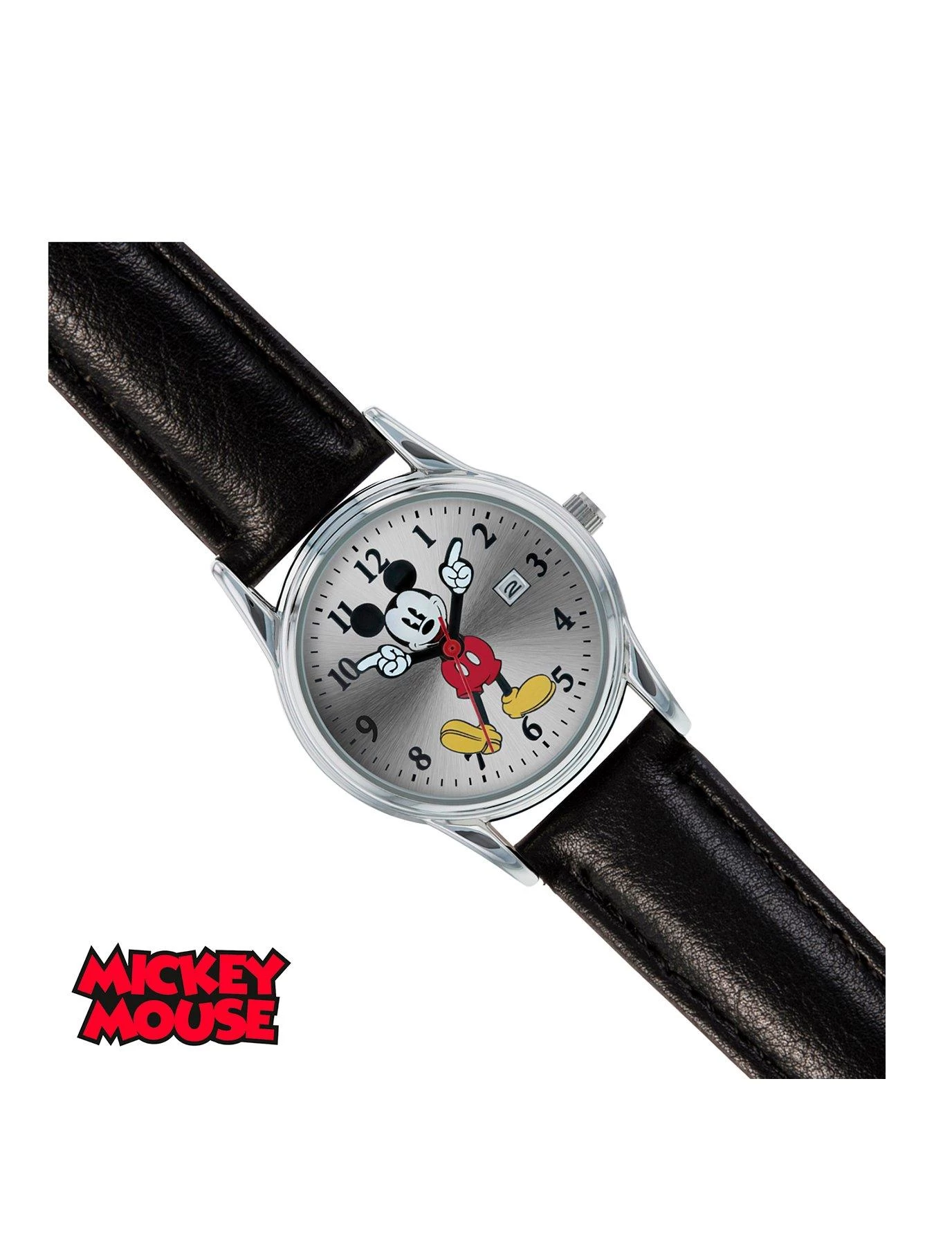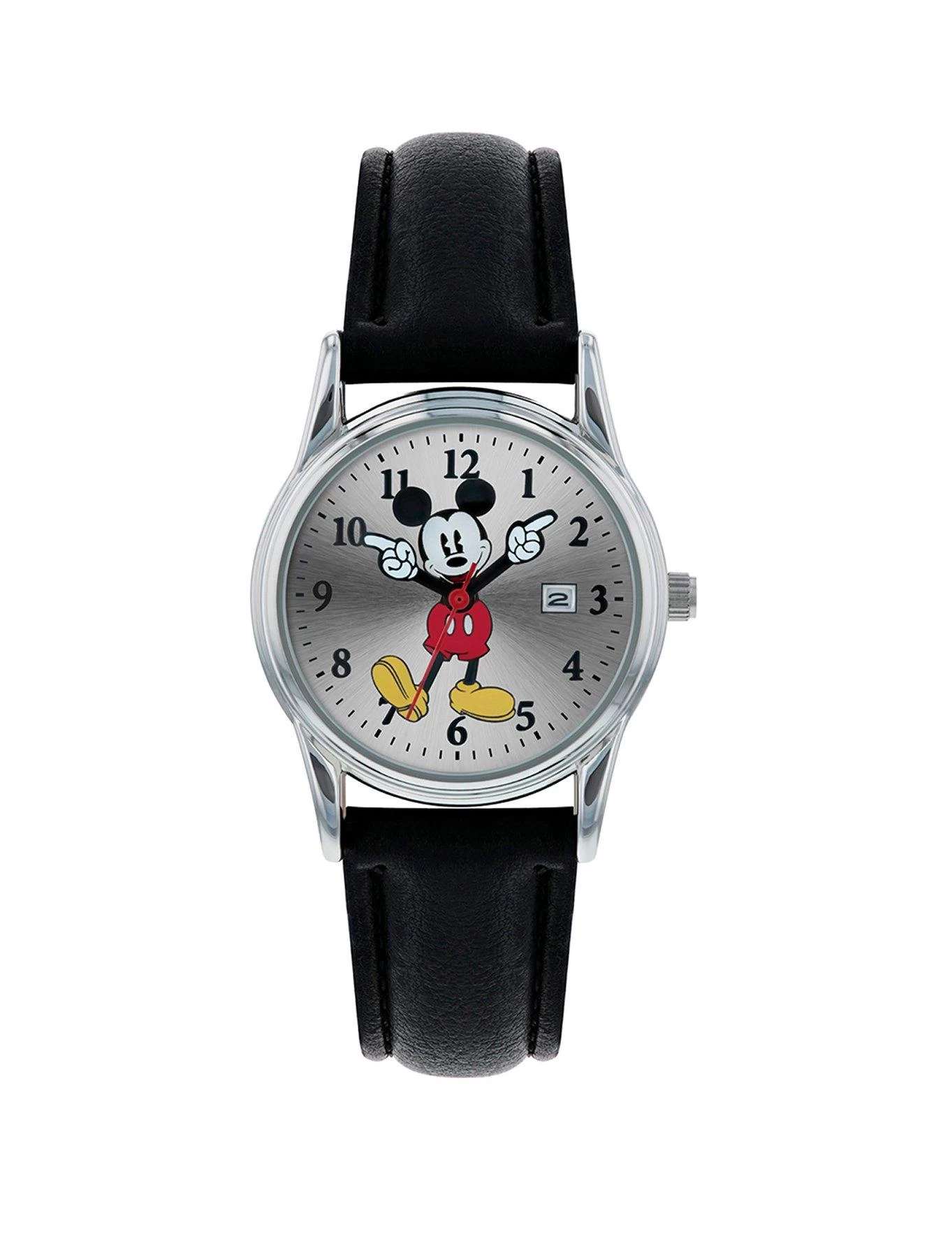Disney Mickey Mouse Black PU Strap Watch. Featuring a Mickey Mouse character dial with novelty hands, a calendar window and black strap with buckle fastening. Packaged in a branded tin box and comes with one year guarantee.