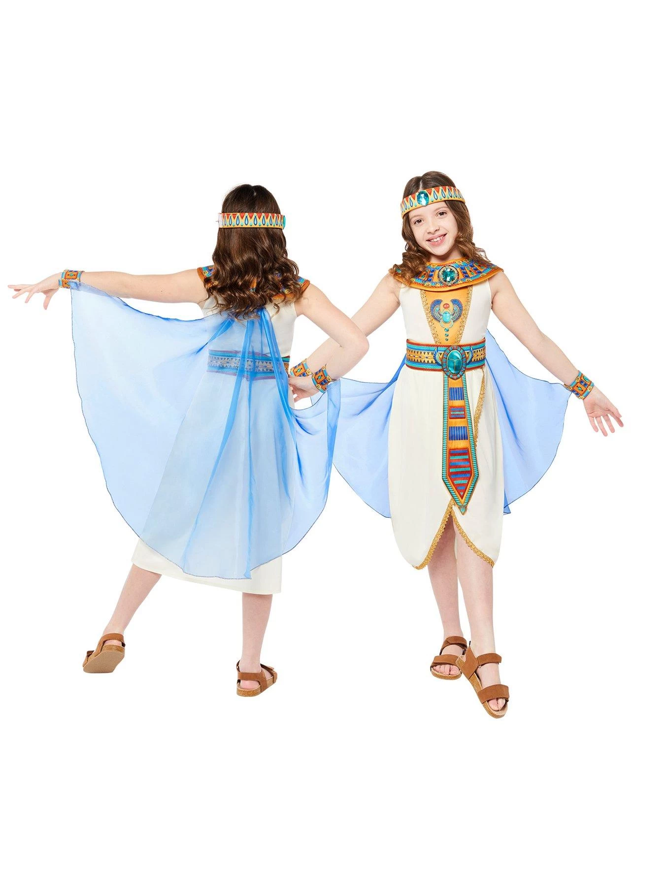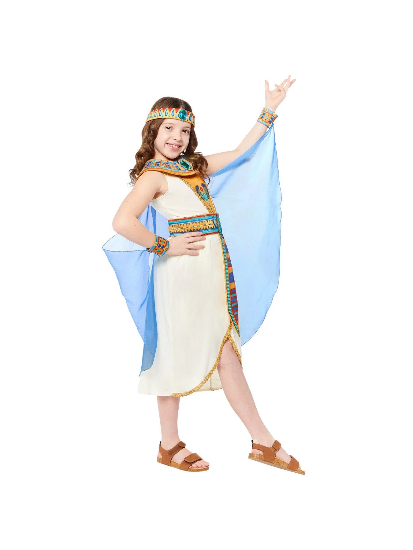 Go back in time to the dawn of the pyramids in this deluxe Egyptian girl costume. A highly detailed dress with gold trim, belt, matching collar, sheer cape with Arm Cuffs and Headpiece.