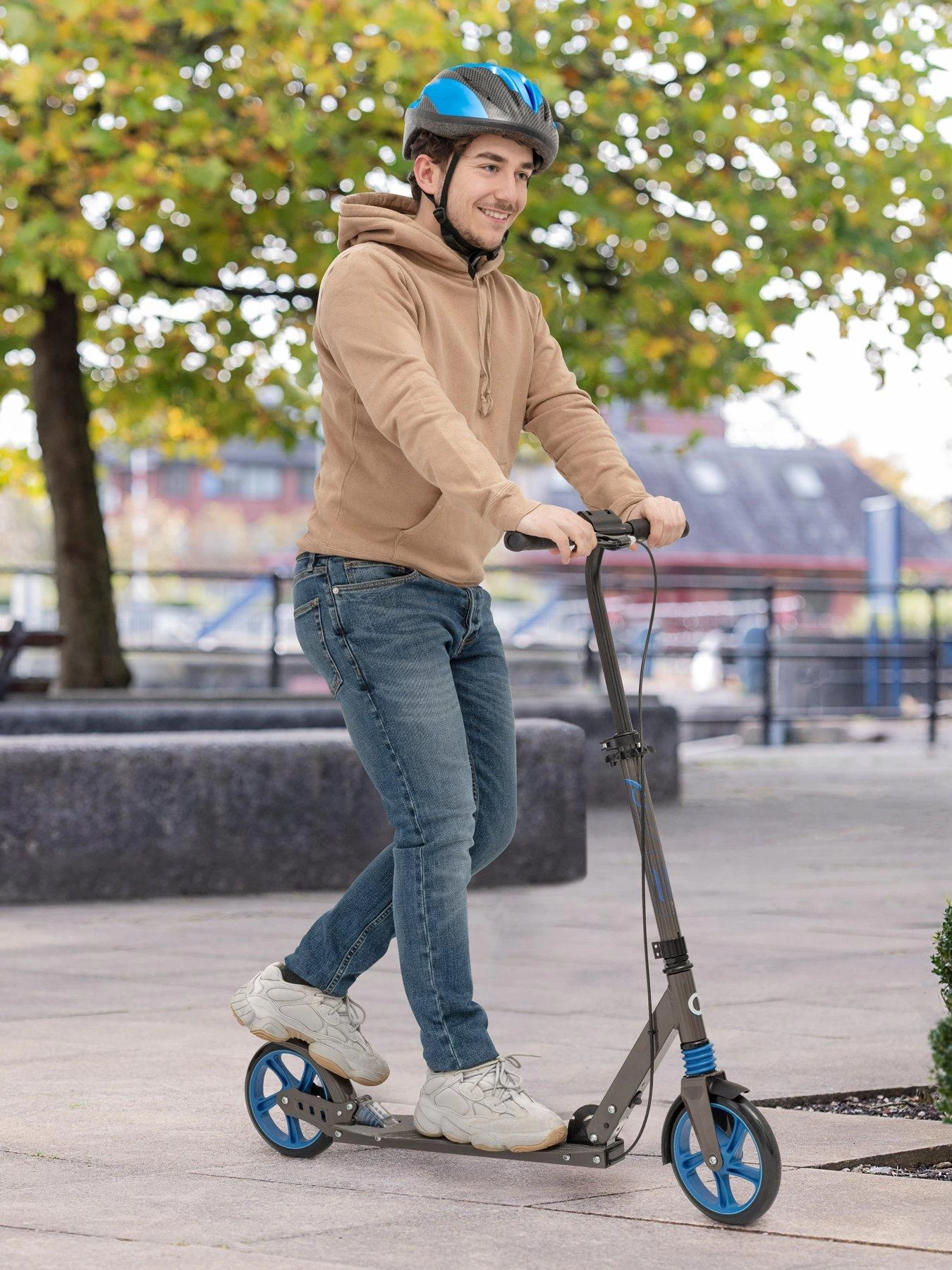 This Street Rider Scooter features 200mm wheels and is suitable for adults, with front and rear suspension.