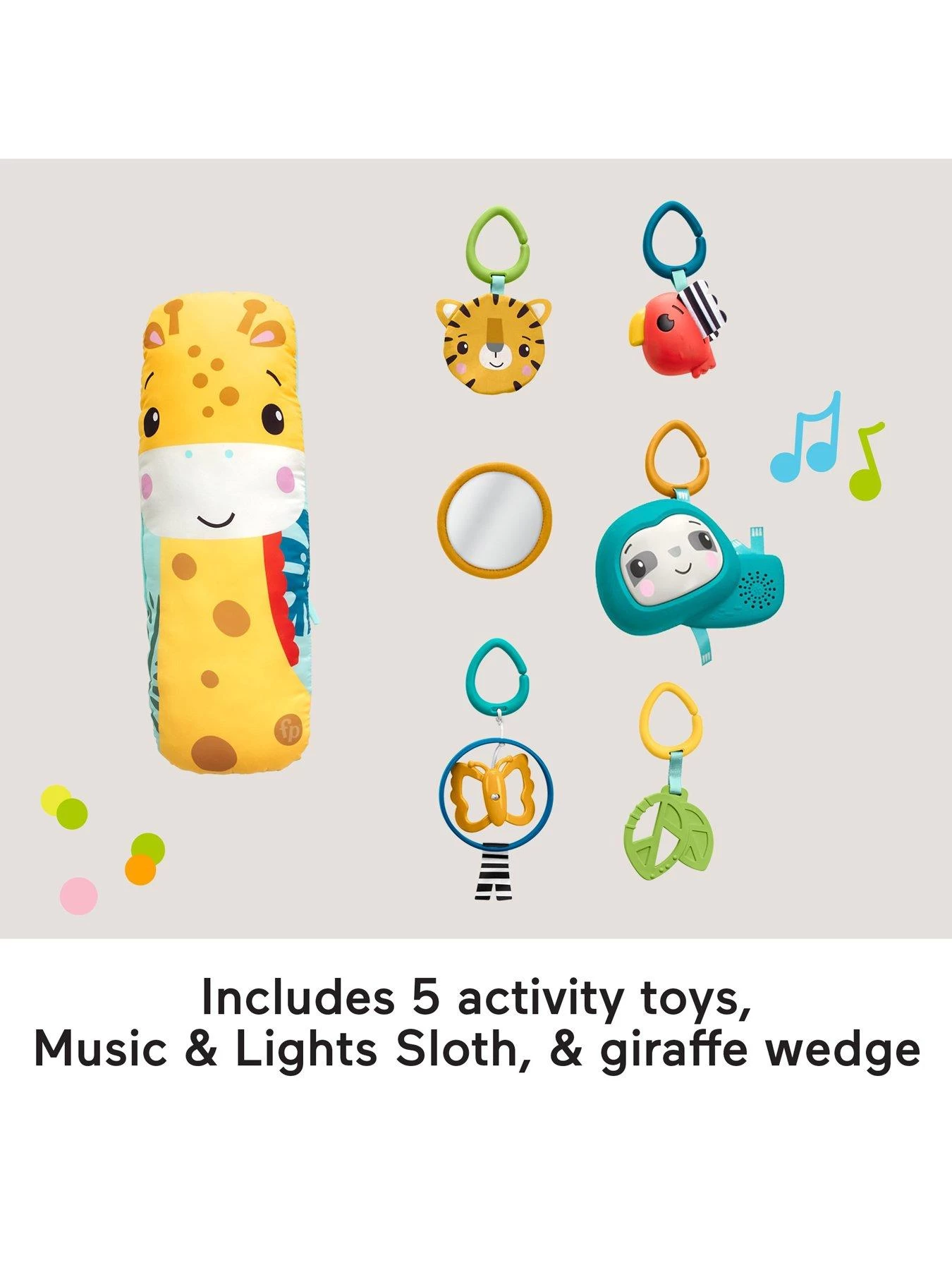 Newborns can lay on the soft Fisher-Price playmat with 6 toys hanging on the arches overhead. For tummy time, the adjustable arch can slide down to bring the toys within reach while the giraffe wedge helps support your baby as they play.
