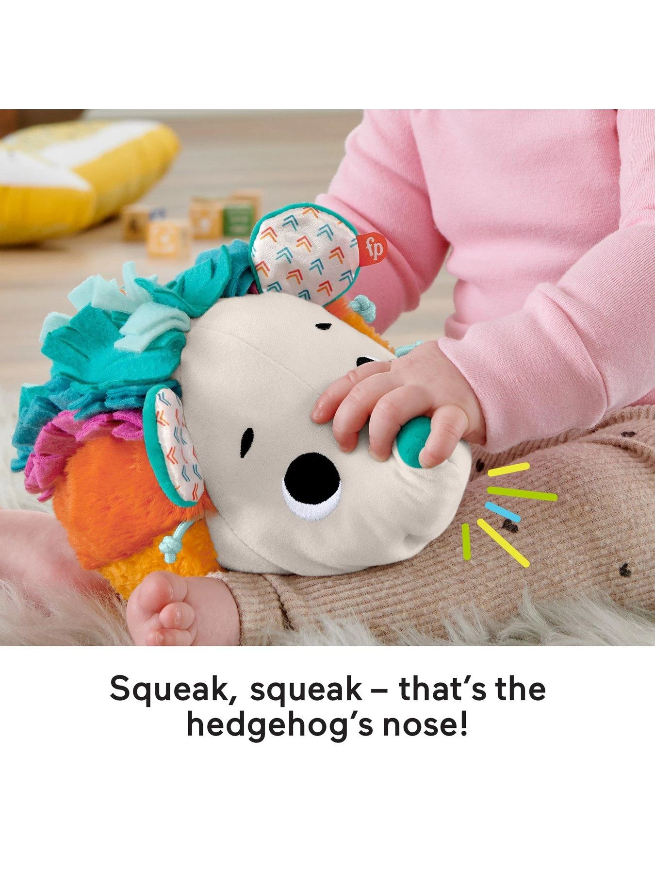 - Sounds like fun! This hedgehog pal has a crinkly belly, a squeaky nose, and rattles when baby shakes it