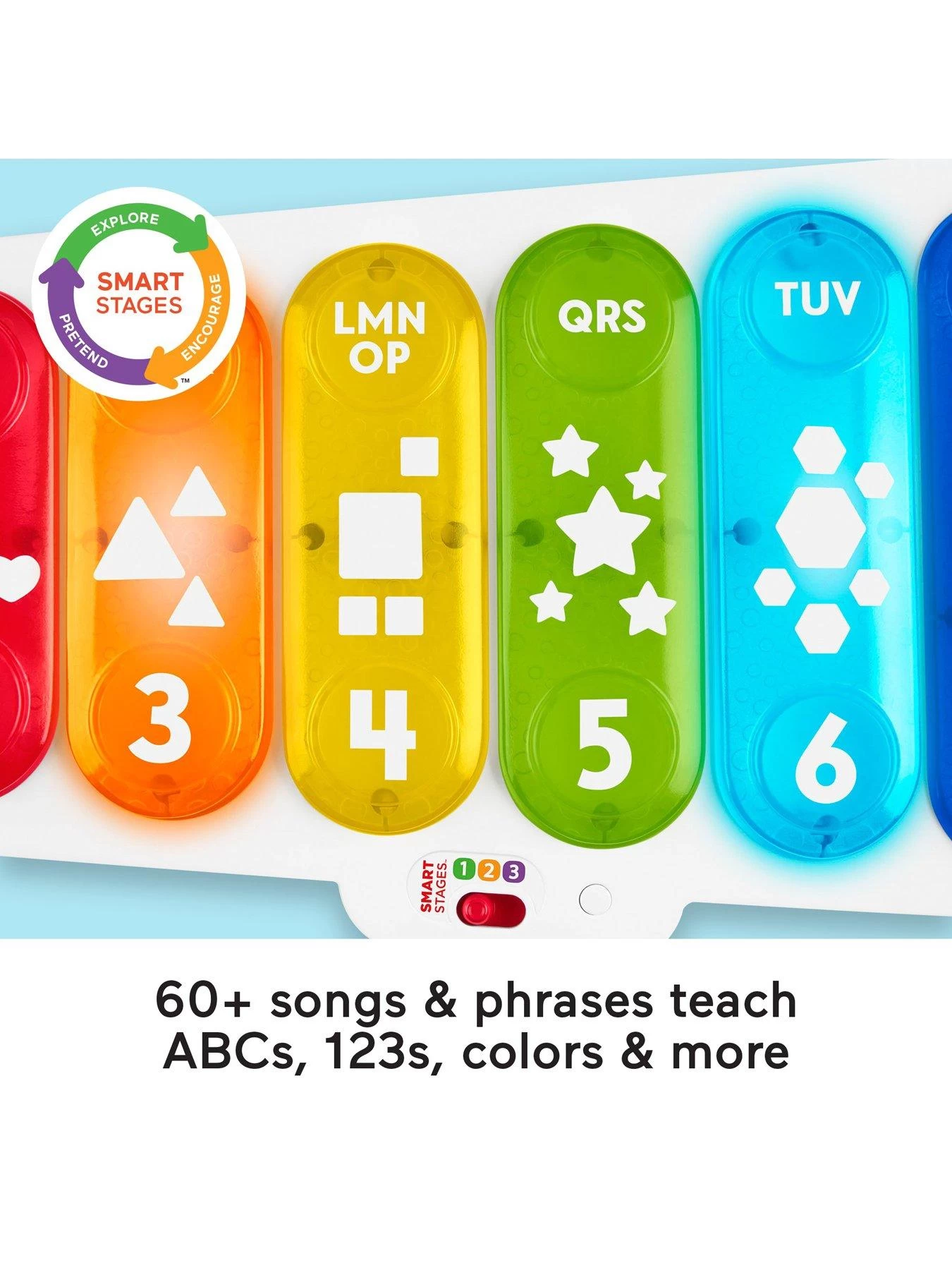 Smart Stages technology lets you switch up the play as your baby grows with 3 levels of learning songs and phrases that teach the alphabet, numbers, shapes and more.