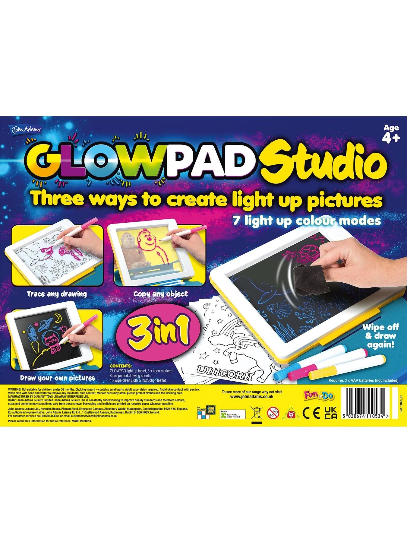 The Glowpad 3-in-1 Studio is the perfect creative partner for any budding artist. The pad can be laid flat to trace any drawing or angled to draw any 3D object. With 7 LED light effects, it makes drawing and tracing easier than ever. It includes a pen section that allows you to neatly clip paint marker pens and there is a fold over protective cover so you can take it anywhere – for art wherever you feel inspired! It is also a great way to entertain kids aged 5+ during long car journeys or trips away from home.