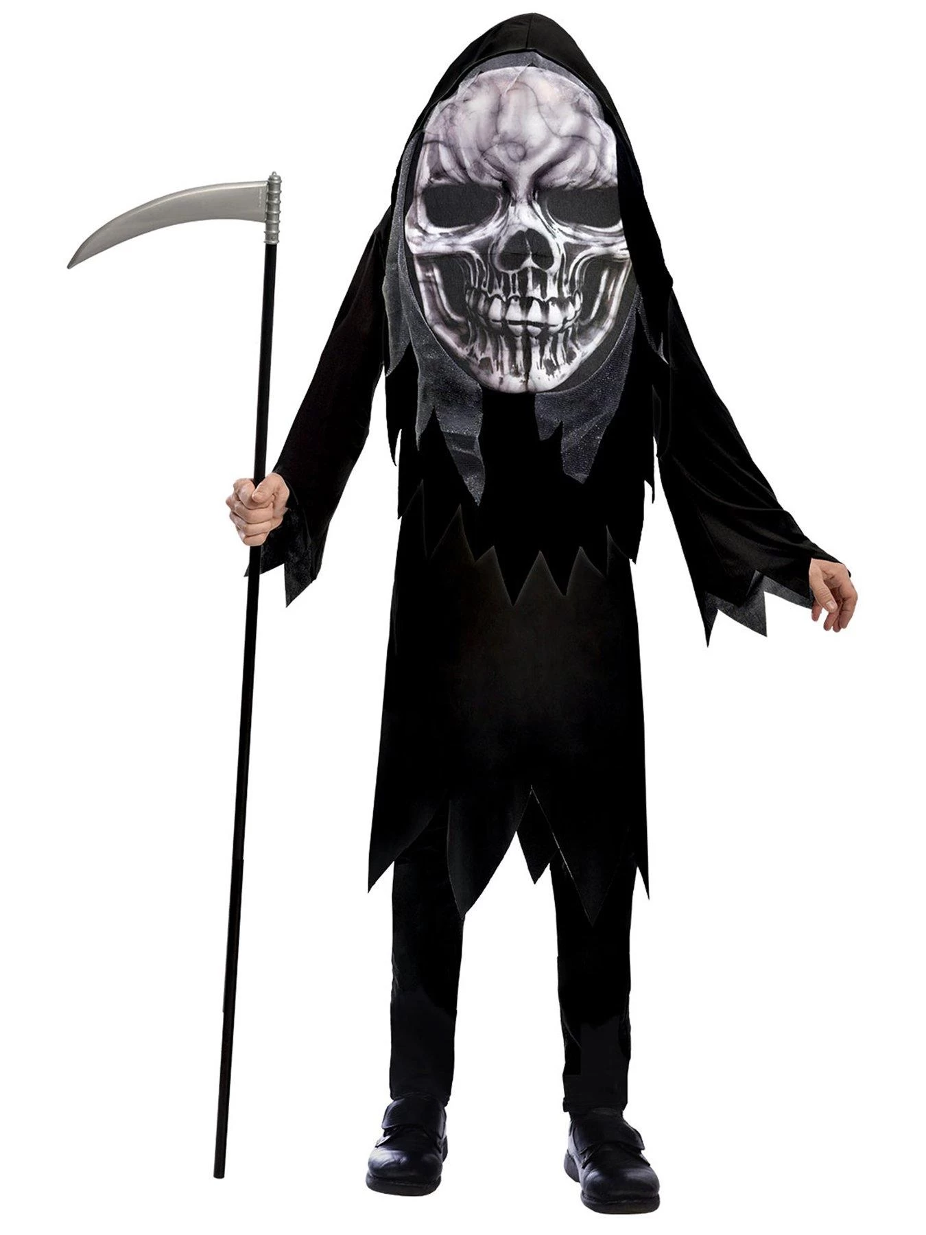 This Halloween big head costume is sure to be a big hit and send people running for the hills! This Grim Reaper costume includes a robe and hood with large printed mask. In fact, it’s sure to give your little ghoul quite a big head when they see how scared everyone is!