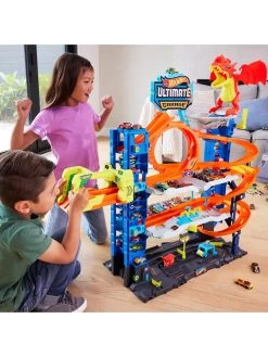 - Race, stunt and do battle with a dragon in the multi-level Hot Wheels City Ultimate Garage.