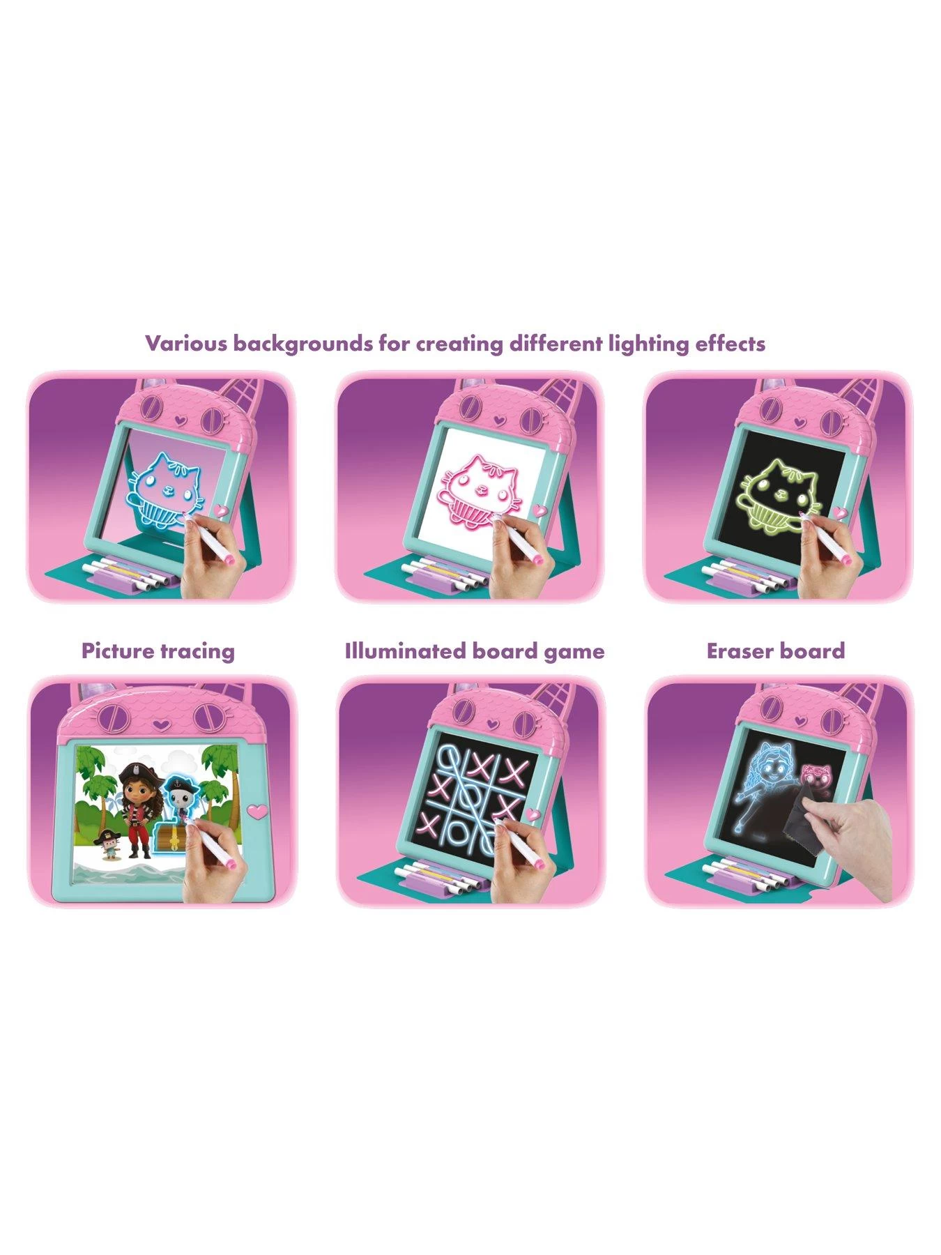 The Gabby’s Dollhouse GLOWPAD 3-in-1 Studio features 3 drawing functions!