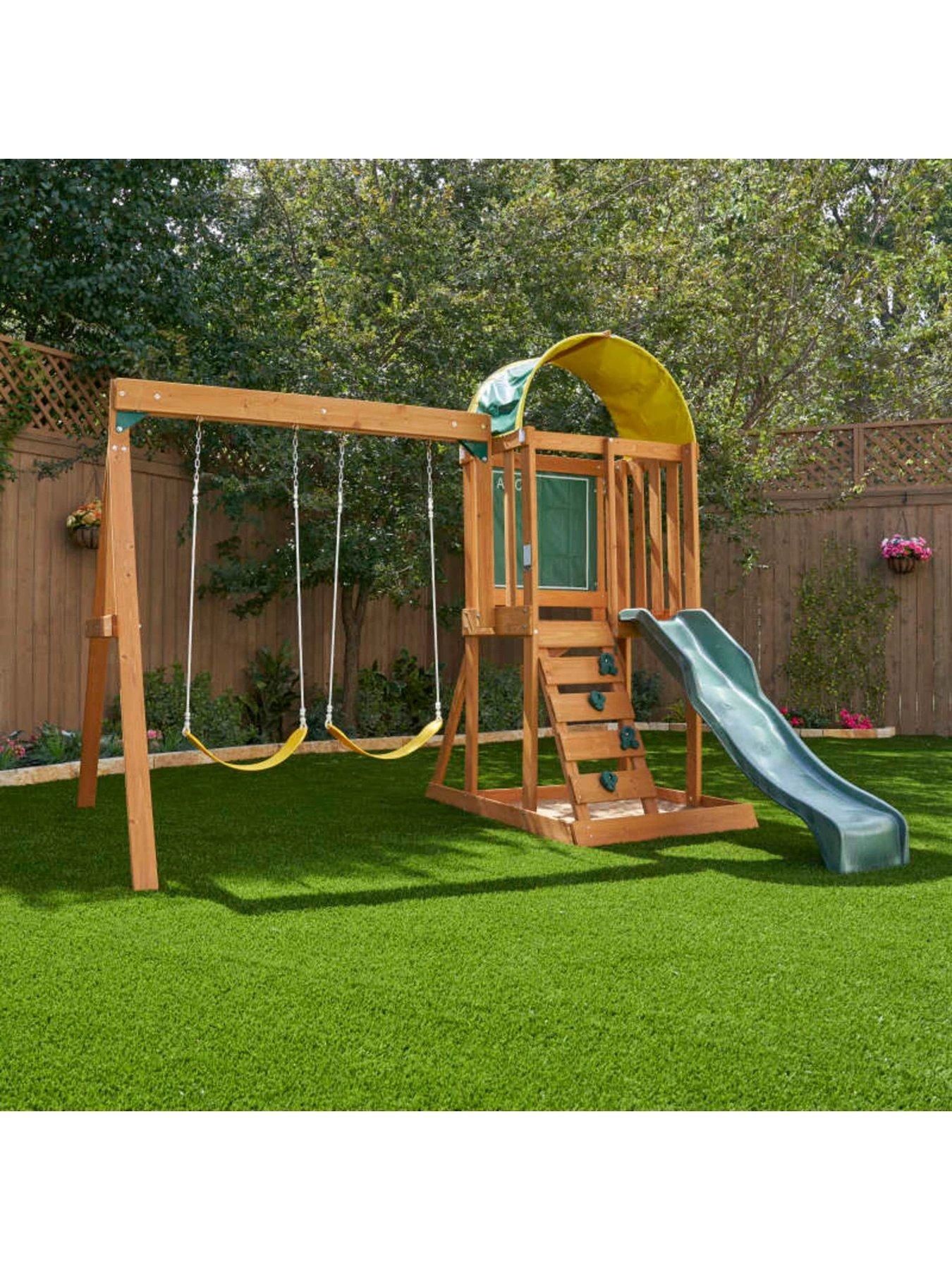 Underneath kids will find a spacious sandbox, and of course there’s also a set of 2 sturdy, bright yellow belt swings too! This really will keep them entertained for hours.