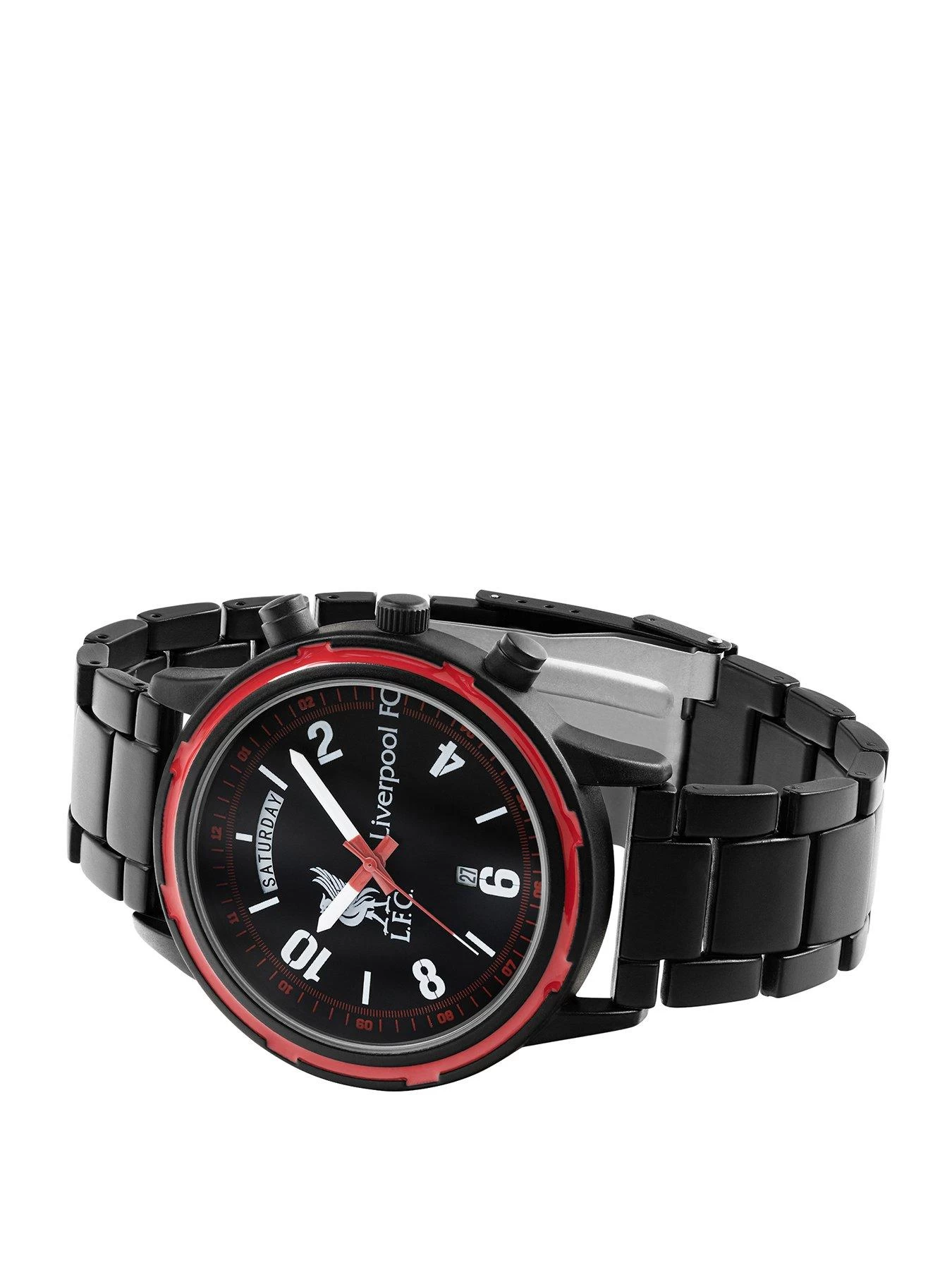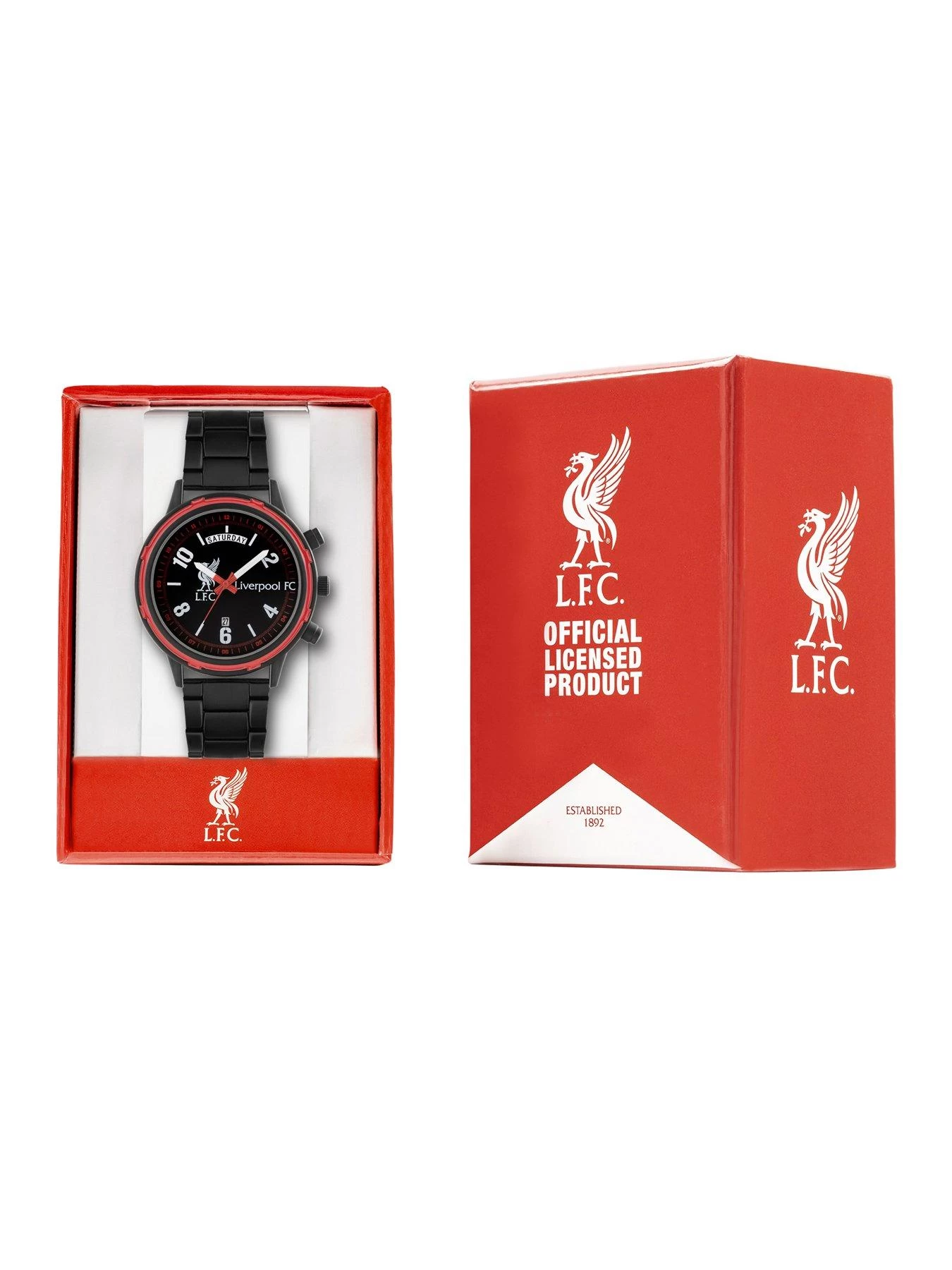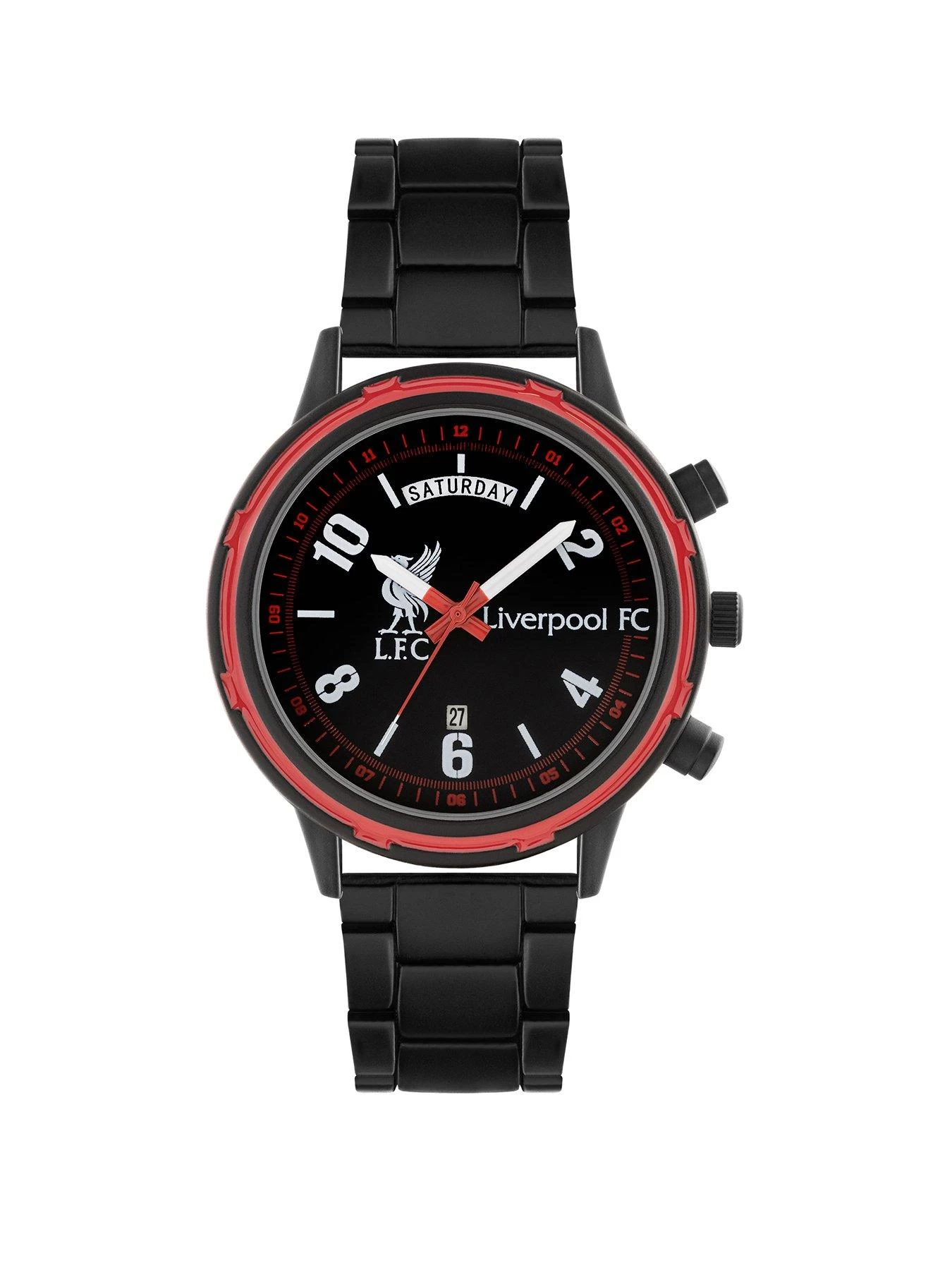 Official Liverpool Football Club black watch. Featuring a Liverpool football club printed dial, round black case with red bezel detail and a black sports bracelet. Packaged in official branded packaging and comes with one year guarantee.
