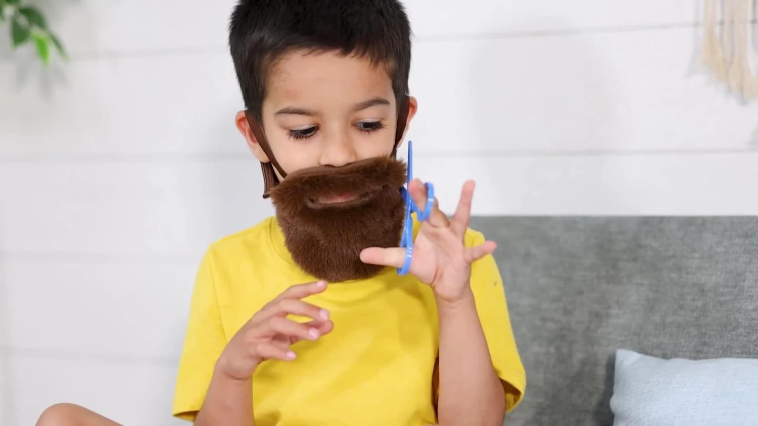 Care for hair and an adjustable beard (sized to fit kids and most adults) with pretend play barber essentials and shaving accessories