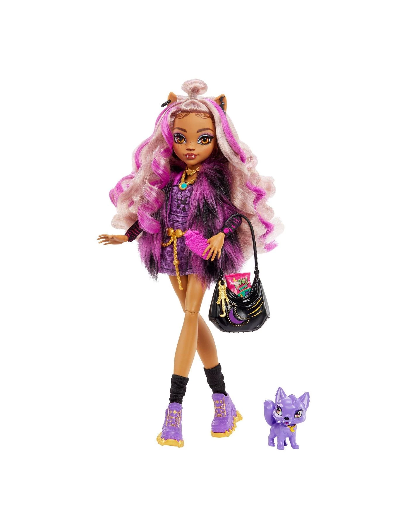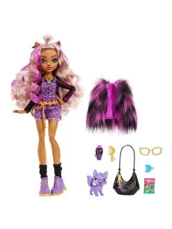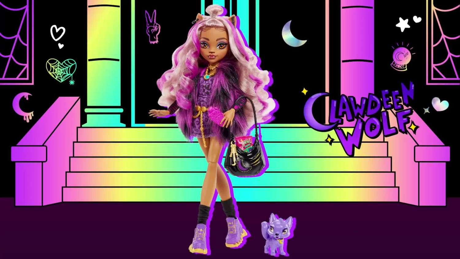 School is back in session, and the Monster High ghouls are showing up in scream-tastic style! Clawdeen Wolf doll struts down the Monster High hallways in a clawsome fashion featuring an animal-print jumper and long-sleeve top with crescent moon print. Her freaky-fabulous, werewolf-inspired look is complete with creeperific sneakers, a black purse and glam, golden glasses and jewelry. Take Clawdeen Wolf doll’s look to the next level with a fierce, faux-fur vest and scary-chic accessories. And inspire spooktacular storytelling with her creepy-cute pet cat, Crescent! Doll cannot stand alone. Colours and decorations may vary.