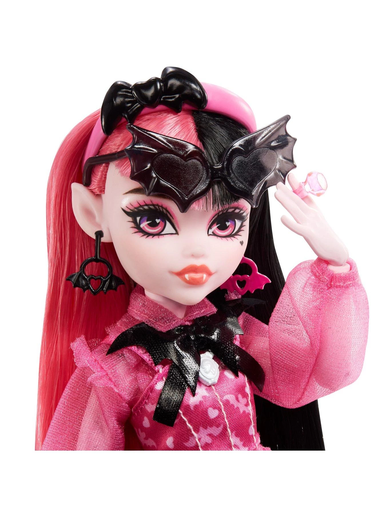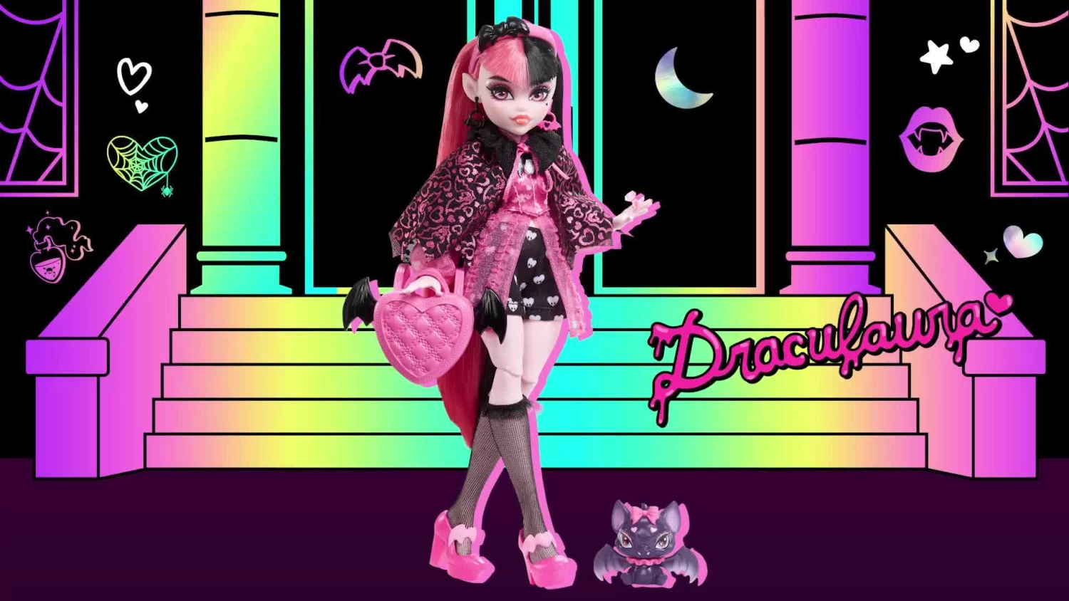 School is back in session, and the Monster High ghouls are showing up in scream-tastic style! Draculaura doll struts down the Monster High hallways in a fang-tastic fashion featuring heart-print shorts and a vampy corset blouse with sheer sleeves. Her freaky-fabulous, vampire-inspired look is complete with sheer, ruffled stockings, pink platform shoes, and a headband and sunglasses with batty details. Take Draculaura doll’s look to the next level with a scary-chic cape and accessories. And inspire spooktacular storytelling with her creepy-cute pet bat, Count Fabulous! Doll cannot stand alone. Colours and decorations may vary.