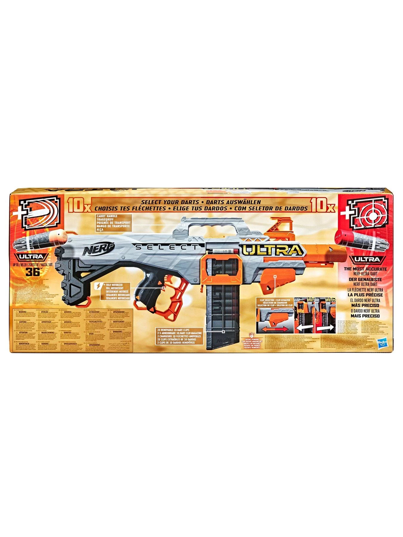 Choose distance or accuracy: Nerf Ultra Select blaster holds 2 clips and includes 10 Nerf Ultra distance darts and 10 Nerf Ultra accuracy darts. Move the clip selector to choose your clip.