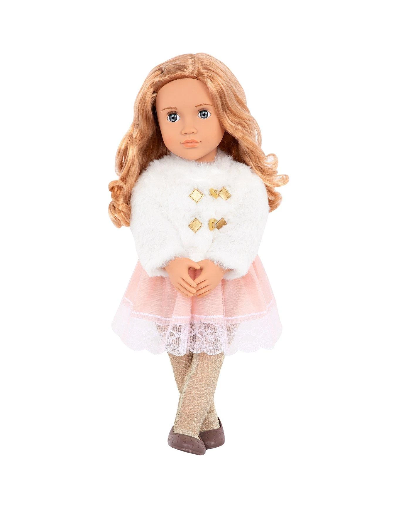 Feel the warmth of the holidays with Our Generation Regular 18-inch Holiday Doll – Halia, a beautiful non-posable doll with shoulder-length, curly blonde hair and unique grey-blue eyes.