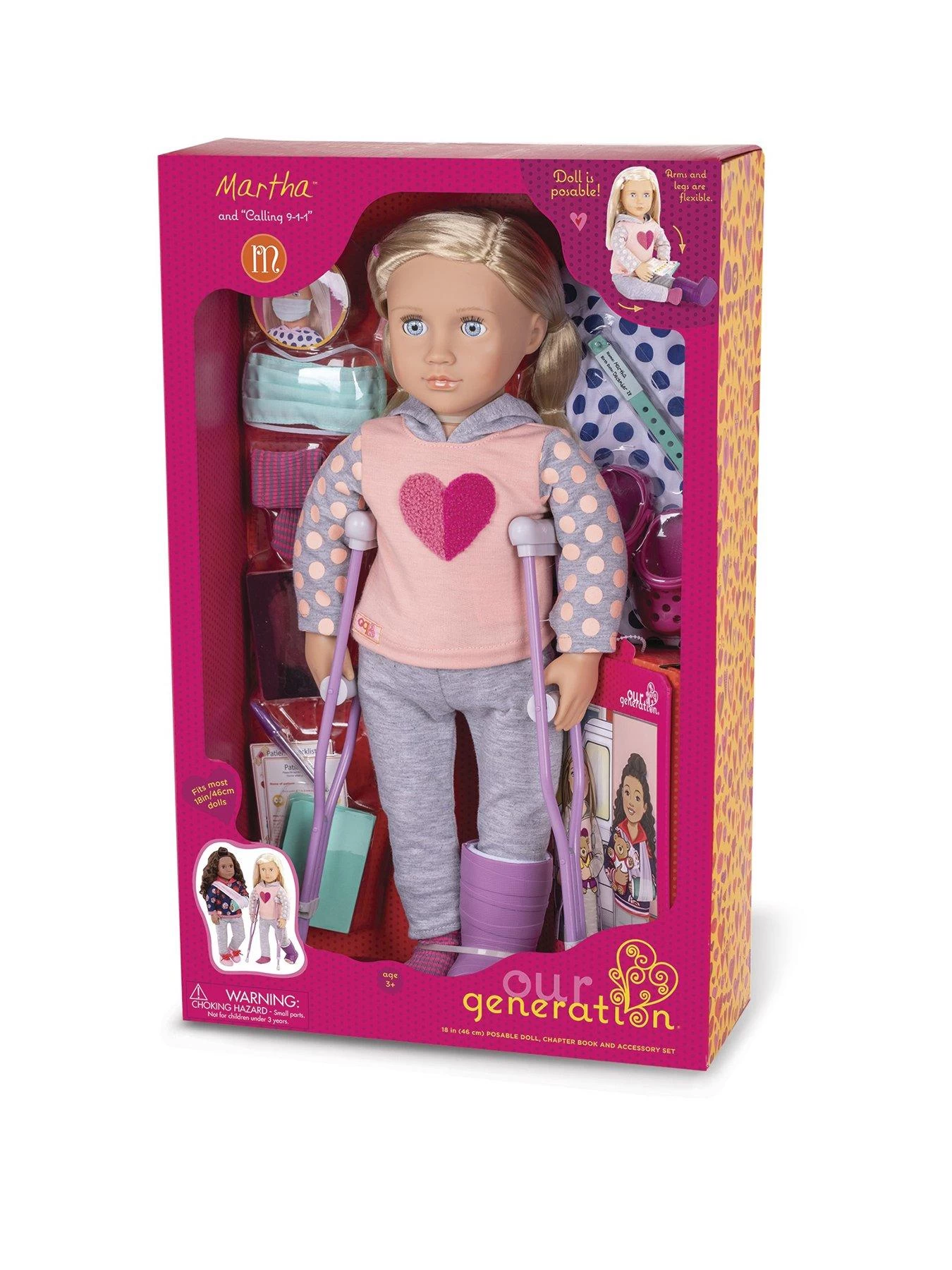 Help Martha get back to happy health! She is posabled doll, she can rotate her neck, arms and legs to help change outfits, and she can bend her knees to keep her foot off the ground as she walks with the crutches. When it’s time for her check-up, change her into the hospital gown – don’t forget the face mask for added safety! Martha also has long blonde hair that’s fun to style, light blue eyes that close when it’s time to rest and her medical bracelet even has her birth date written on it!