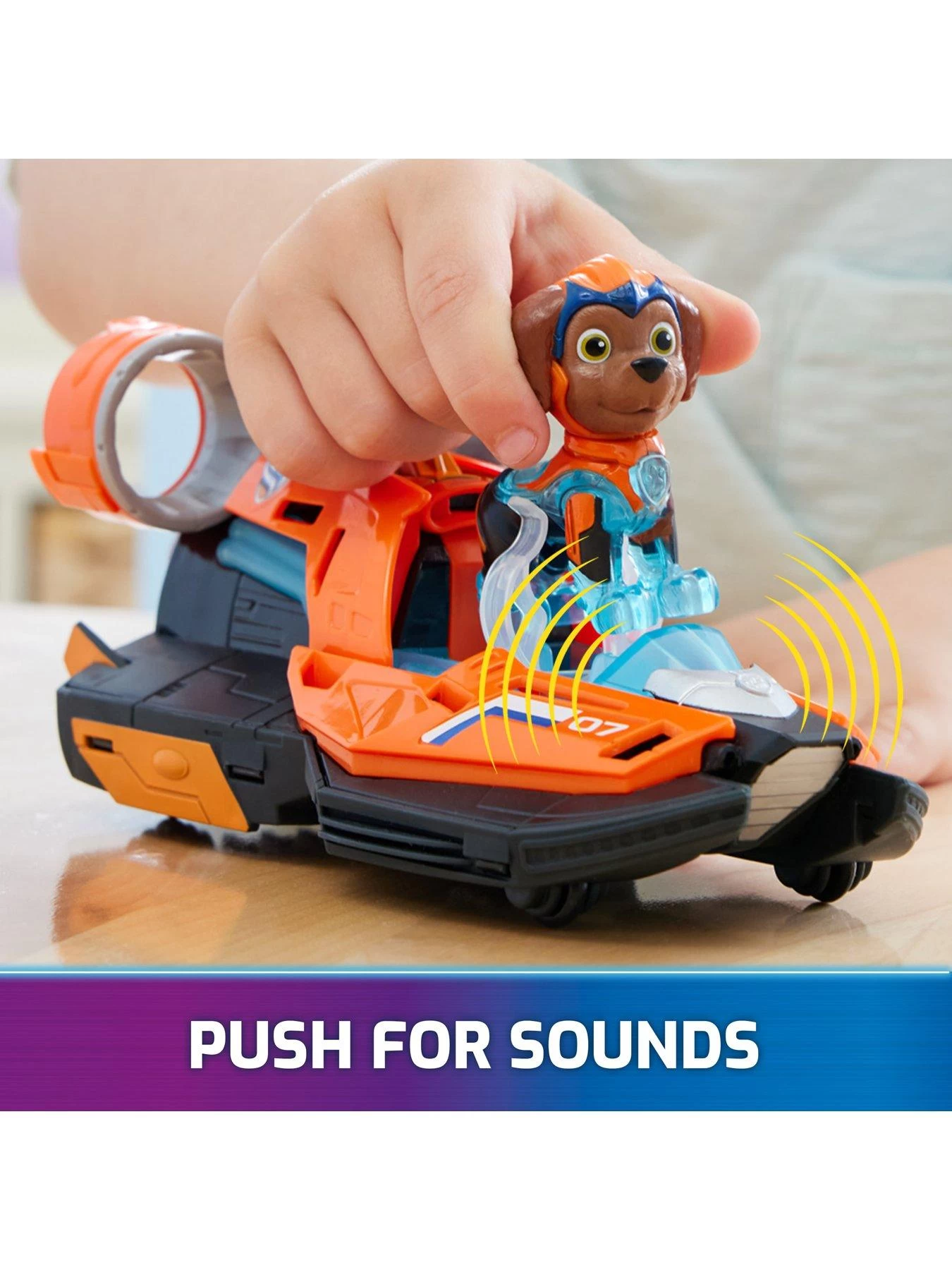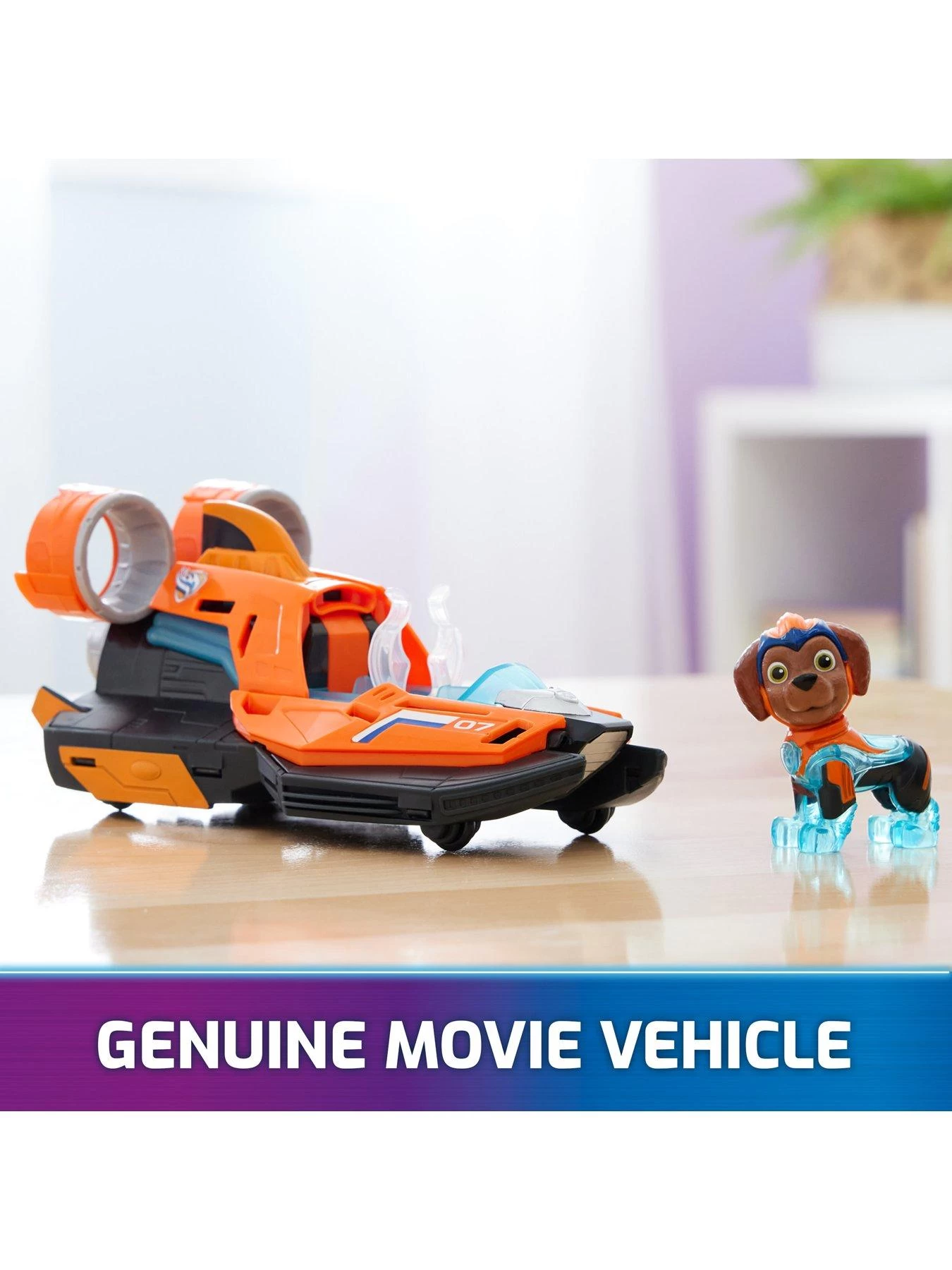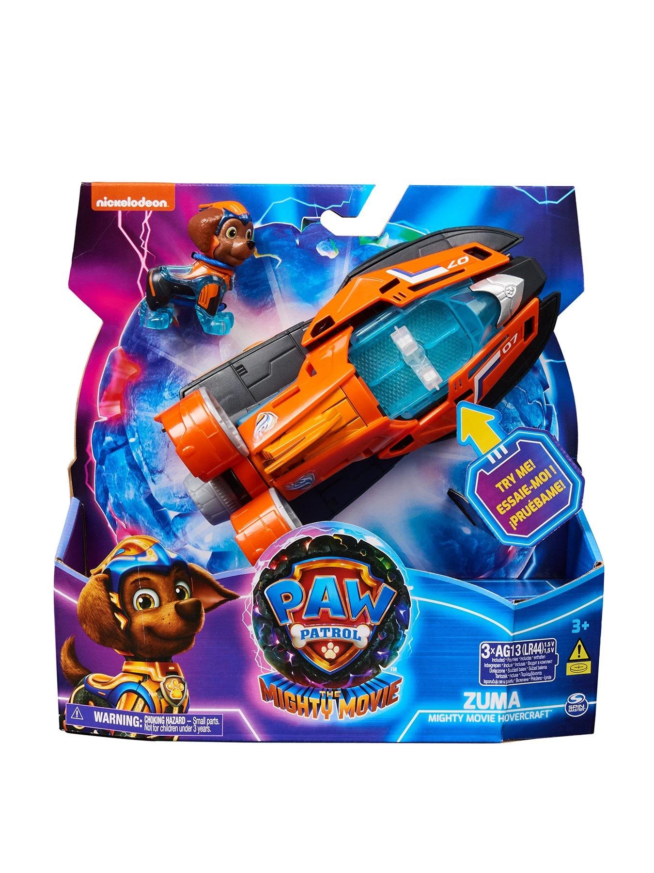 Team up with Zuma for exciting rescue adventures, right out of the big screen, in his PAW Patrol: The Mighty Movie rescue vehicle! This PAW Patrol toy hovercraft measures 7-inches long and stands almost 4-inches tall, with a super-sleek design and exciting sound effects, with synchronized flashing lights, that make it a fantastic addition to any PAW Patrol fans collection (Batteries Included)! Dressed in his orange PAW Patrol: The Mighty Movie uniform, with translucent sections and a cool helmet, clip Zuma onto the seat of his jet boat toy to activate the illumination in multiple areas of the vehicle, and watch his paws light up, to make for even more exciting, super-charged, rescues as you roll his rescue vehicle from one mission to another!
