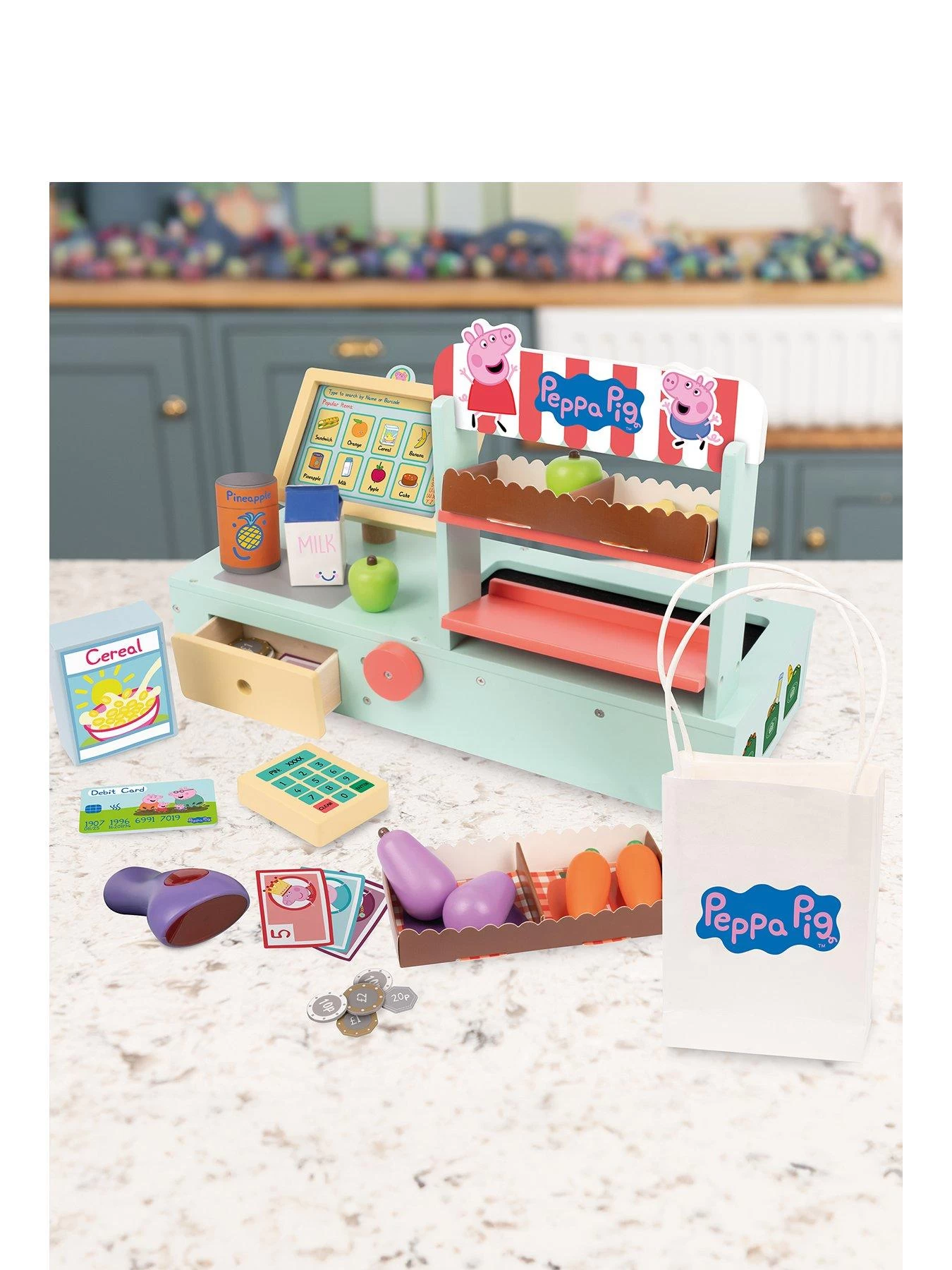 Play shop keeper with Peppa Pig with this amazing Tabletop Supermarket! With all sorts of items, from cereal to fruit and veg, customers can pick what items they want and place them on the conveyor belt. With a rotating till screen, press which items have been put through. The 3 card inserts offer different visuals of the different items. Use the card reader for payment or if the customer is paying with cash, place the coins and notes into the sliding drawer to keep the money safe! Peppa’s Tabletop Supermarket is a fantastic play set to encourage creativity as well as skills in counting money and giving the correct change.