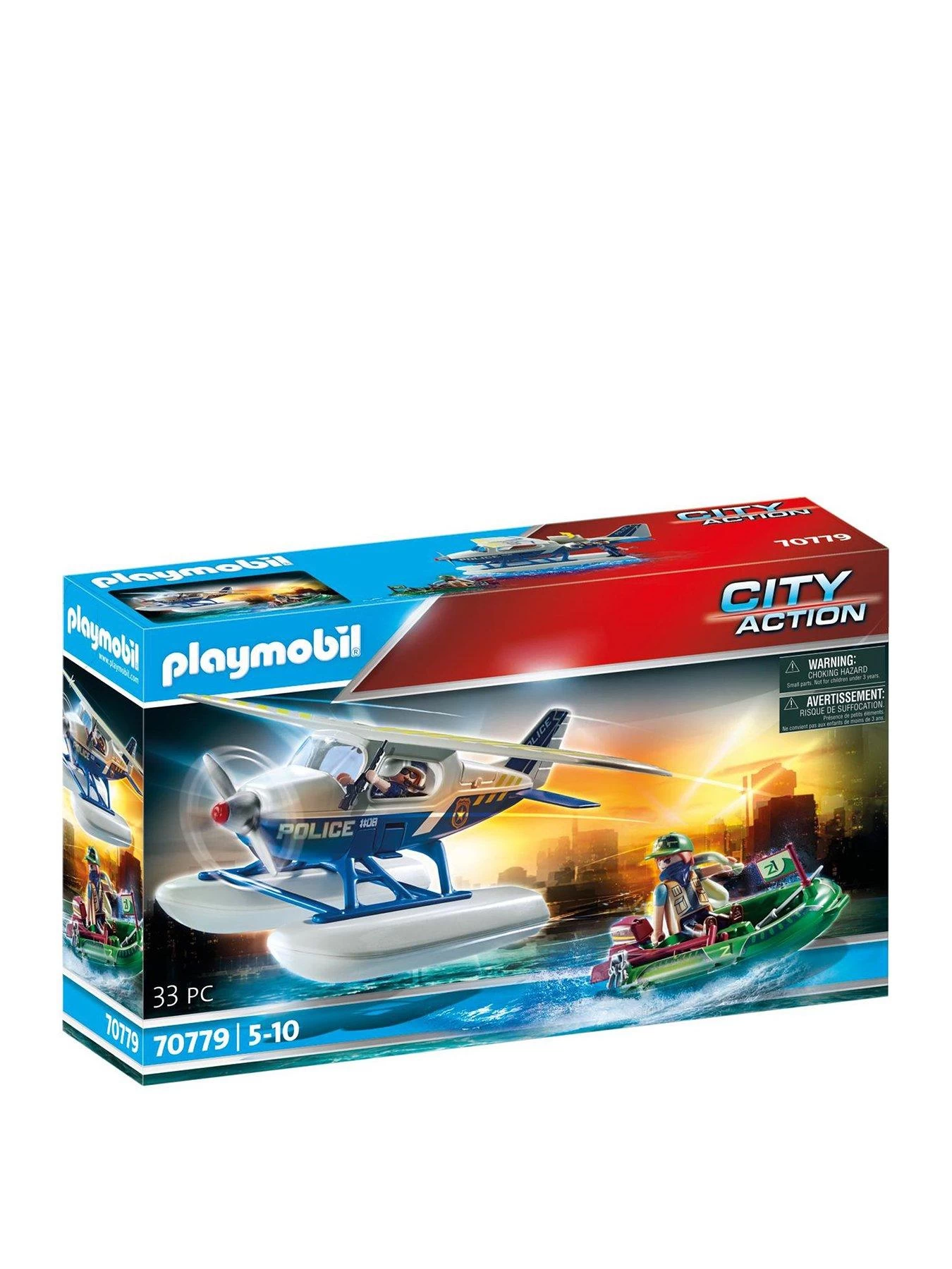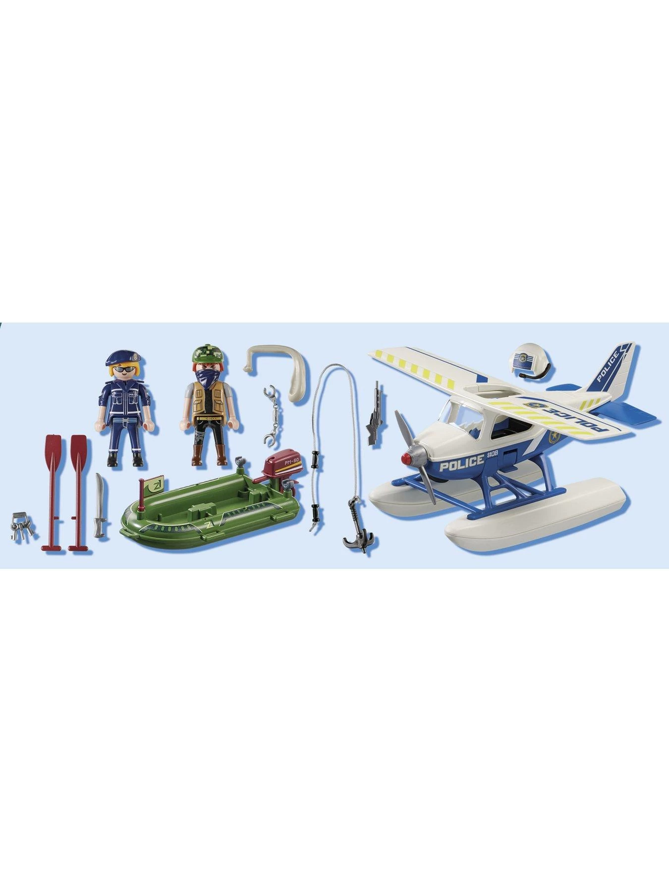 The brave PLAYMOBIL police keep a watchful eye over the city from the air as well as on the ground. A criminal is on the run with his smuggled goods and the thief tries to escape in the rubber dinghy, but the clever pilot keeps an eye on him at all times from the seaplane cockpit and doesn’t let him escape. She skilfully lands the aircraft on the lake and leaves him no way out. Now the fugitive is handcuffed and it’s off to the police station! The playset contains two PLAYMOBIL figures, a seaplane, a dinghy which floats on water, a pilot’s helmet and beret, handcuffs and many more extras for exciting police adventures. The plane can also float on water and the propellers rotate.