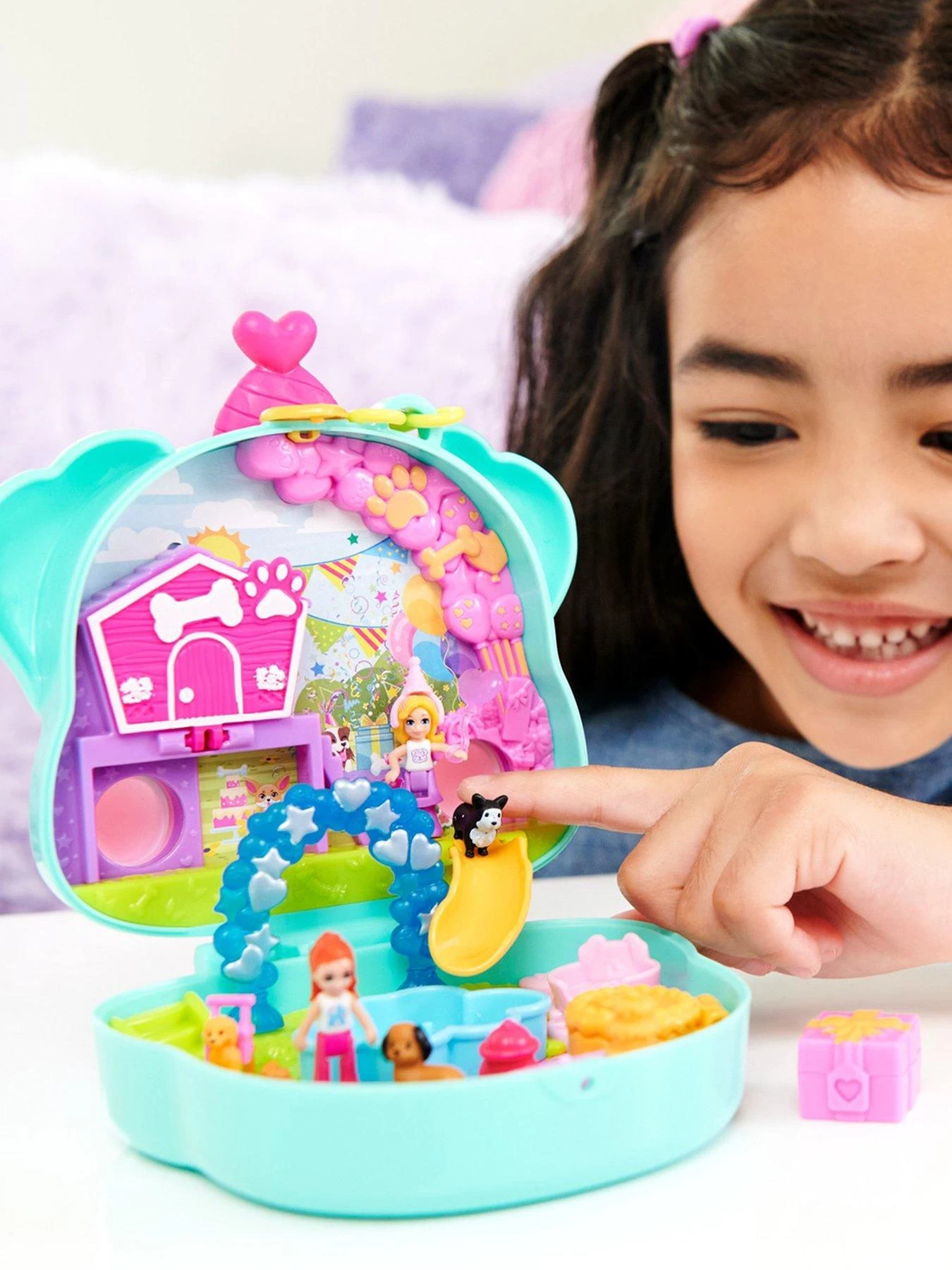Get ready for fun with Polly Pocket! Perfect for play at home or on the go, this doggy birthday bash compact features a fun pet birthday theme.