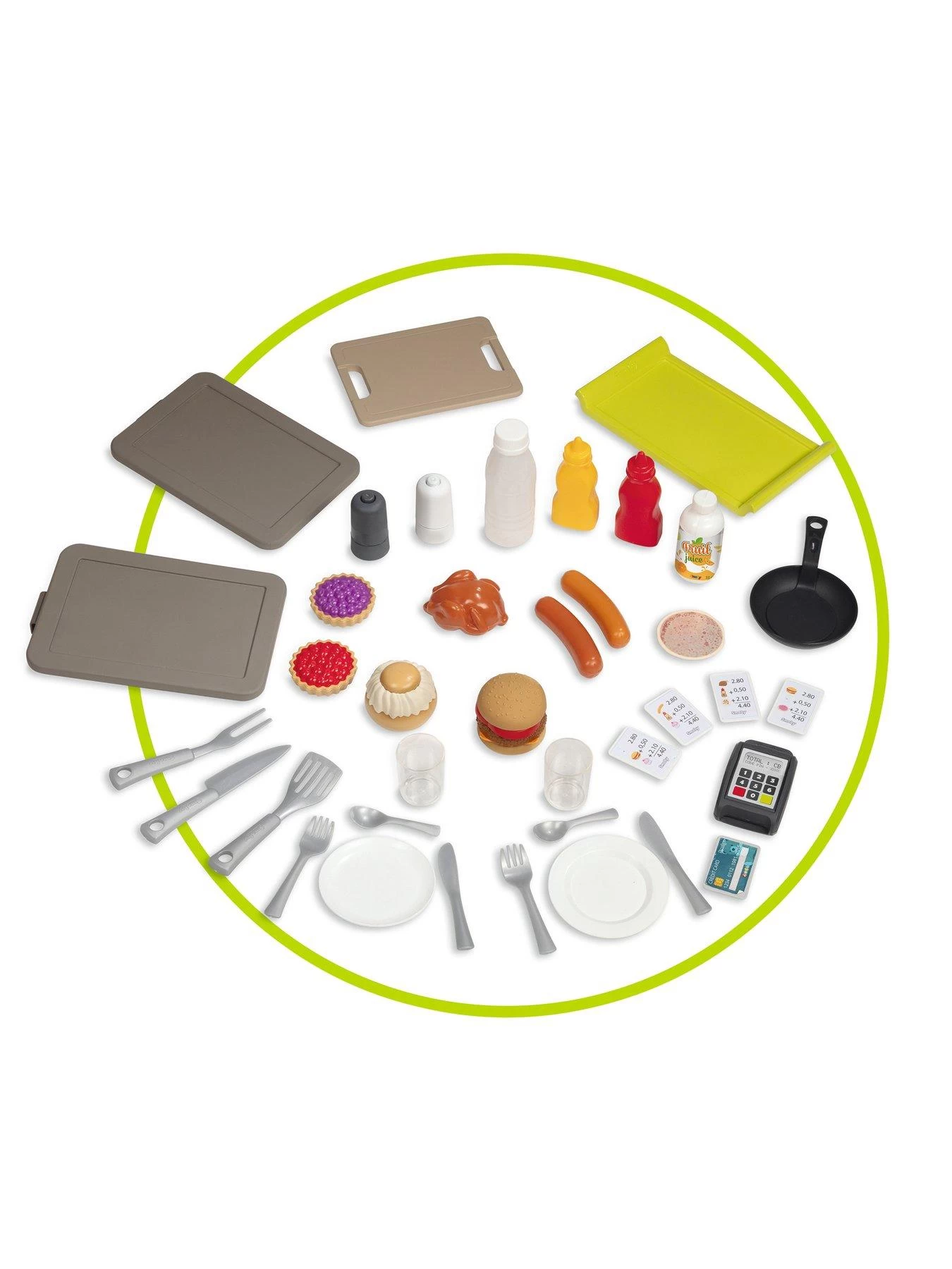 2Â storage shelves are included to store the many accessories, including sweet and savoury foods, drinks, cutlery, cooking utensils, coins, credit card and tickets, a salt and a pepper shaker, a frying pan to flip the pancakes, ketchup and mustard sauces.