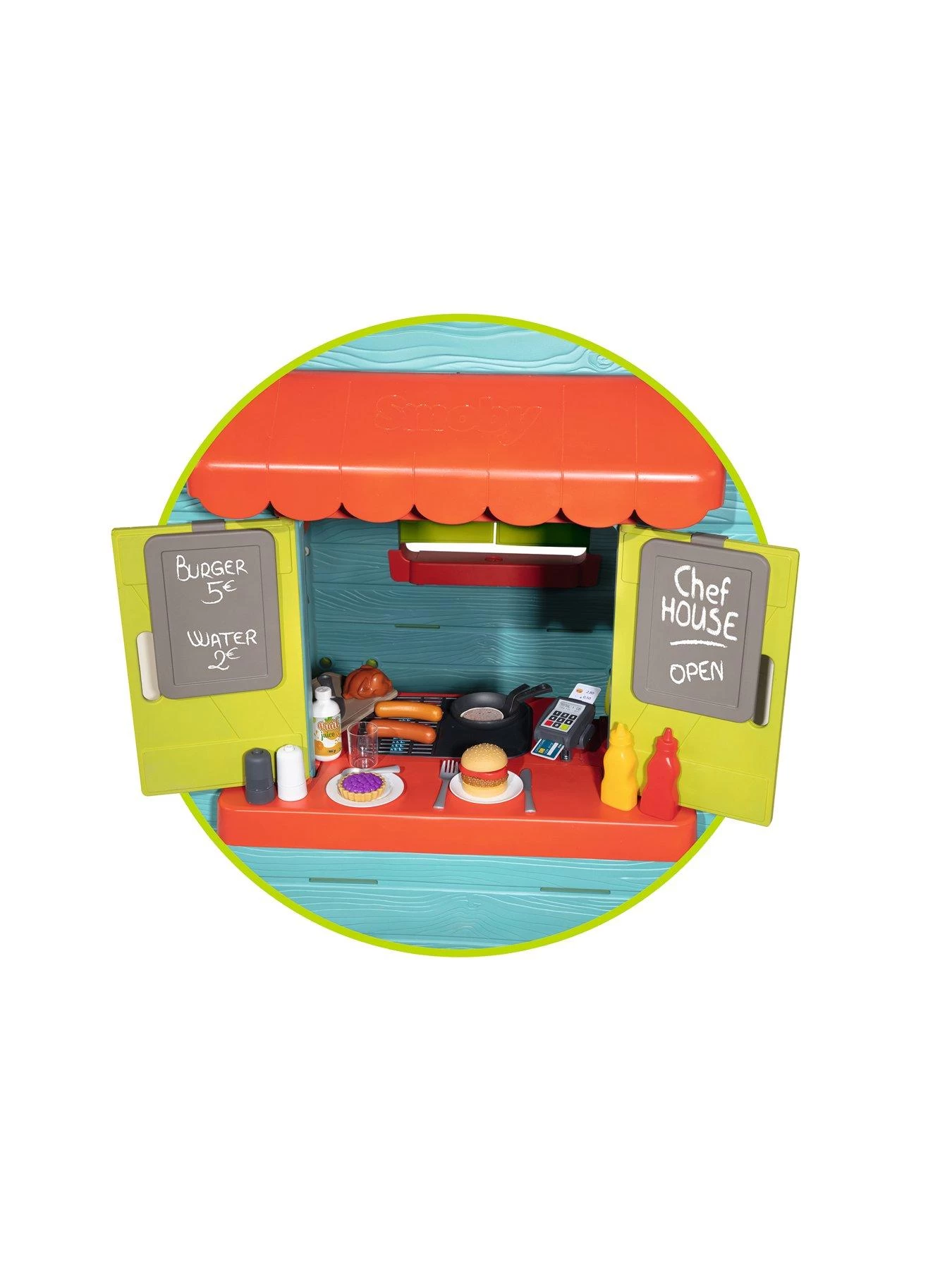2Â removable slates are also provided to write the menu and opening hours of the Food House. They can be fixed on the shutters of the front of the house.Suitable for children aged 2 years and over.
