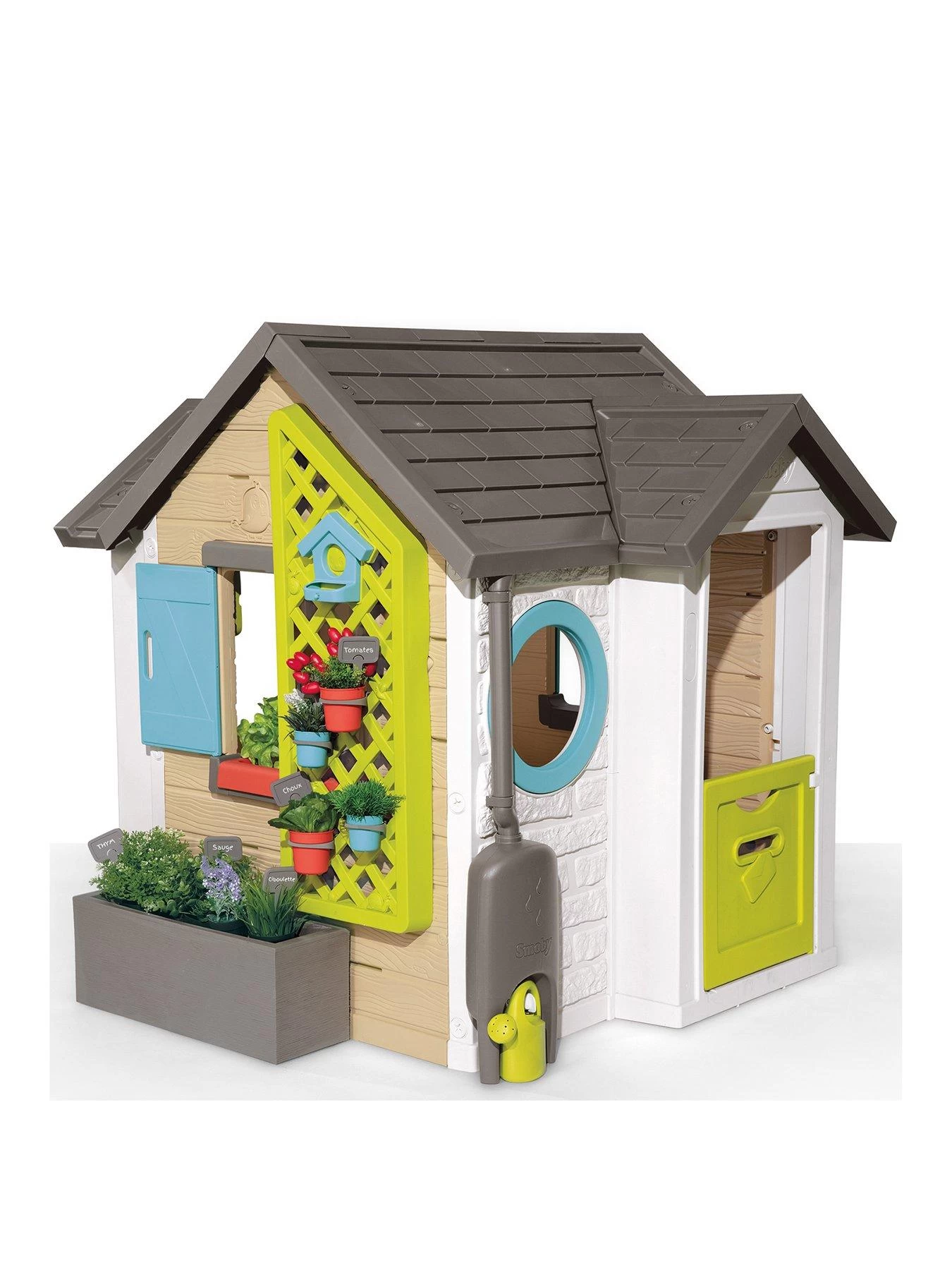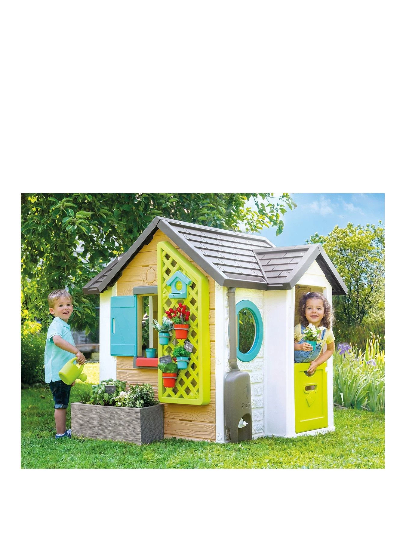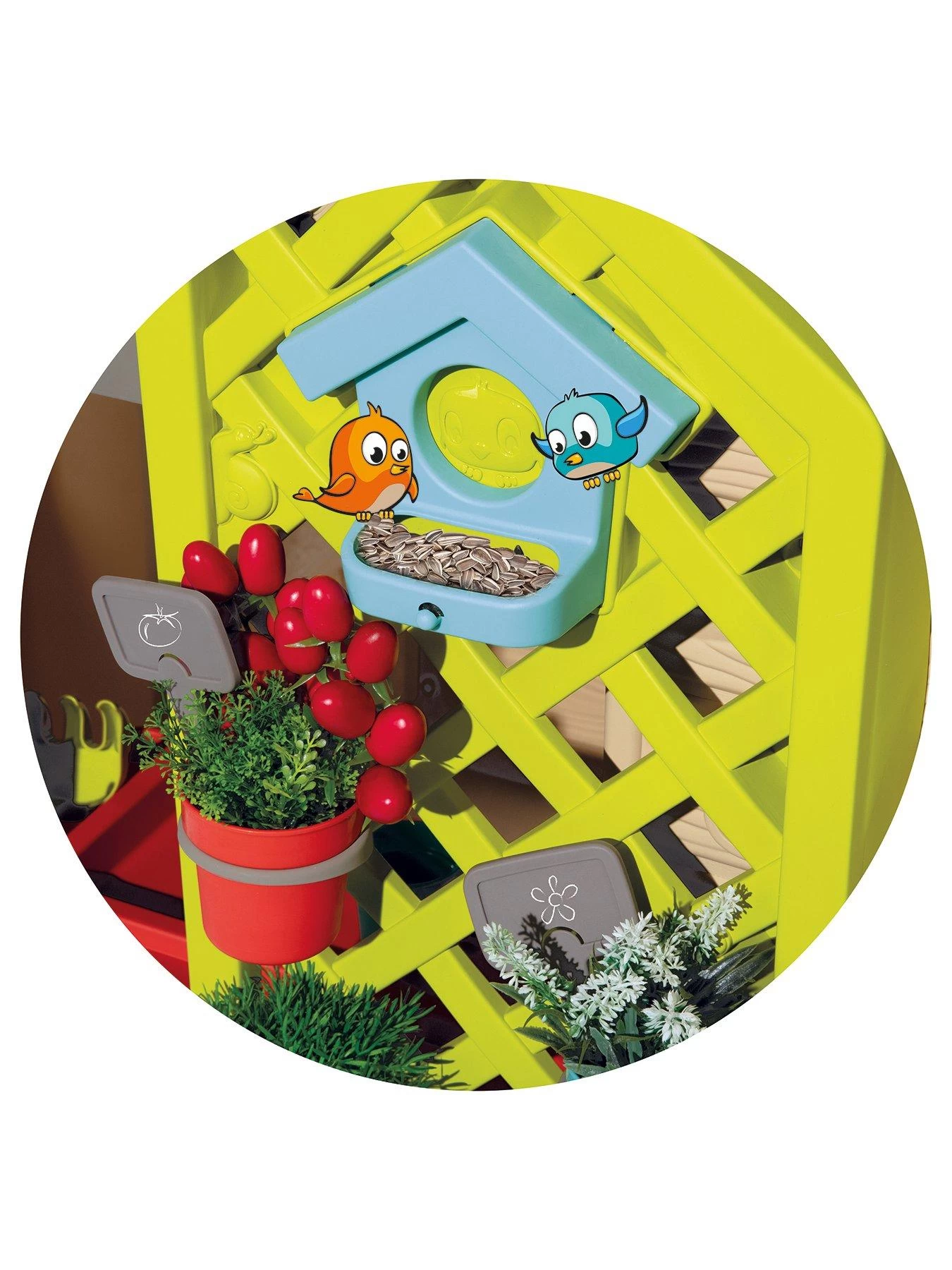 This modern Smoby playhouse features 2 half-doors, 2 windows with panel shutters and 2 porthole windows. Many playing functions are included, such as a real planter, a trellis to fix few flower pots and the bird feeder, and the water butt with its watering can.
