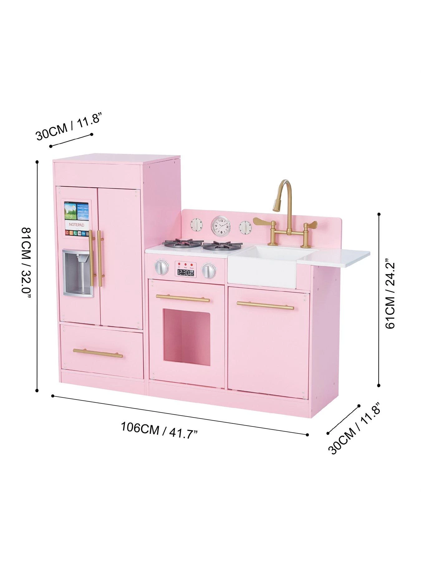 The Little Chef Chelsea toy kitchen would make the perfect addition to any home, classroom, preschool, or day-care playroom. This retro vintage kids’ kitchen has been designed with bright, eye-catching colours to help stimulate everyday engaging play. Realistic and interactive features include: openable doors, turning and clicking oven knobs, 2 oven burners, drawers, a sink, under-sink cabinet, toy ice dispenser and more.