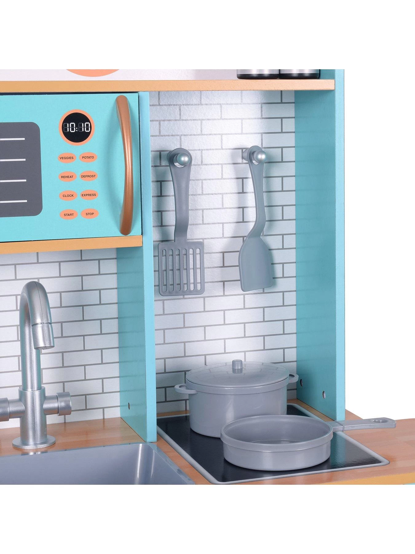 Your little one will be cooking up a storm with this retro-style kids’ wooden kitchen by Teamson! Fully interactive and beautifully made, this compact toy kitchen is bright aqua blue /white and includes seven accessories perfect for encouraging hand eye coordination in a fun and educational way.
