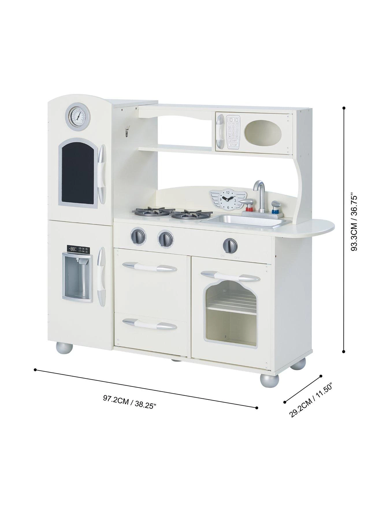 Included are simple, easy-to-follow instructions to ensure a quick, stress-free assembly in under 30 minutes. The wooden toy kitchen measures (cm): 97.2(L) x 29.2(W) x 93.3(H) and is recommended for children aged 3 years+.