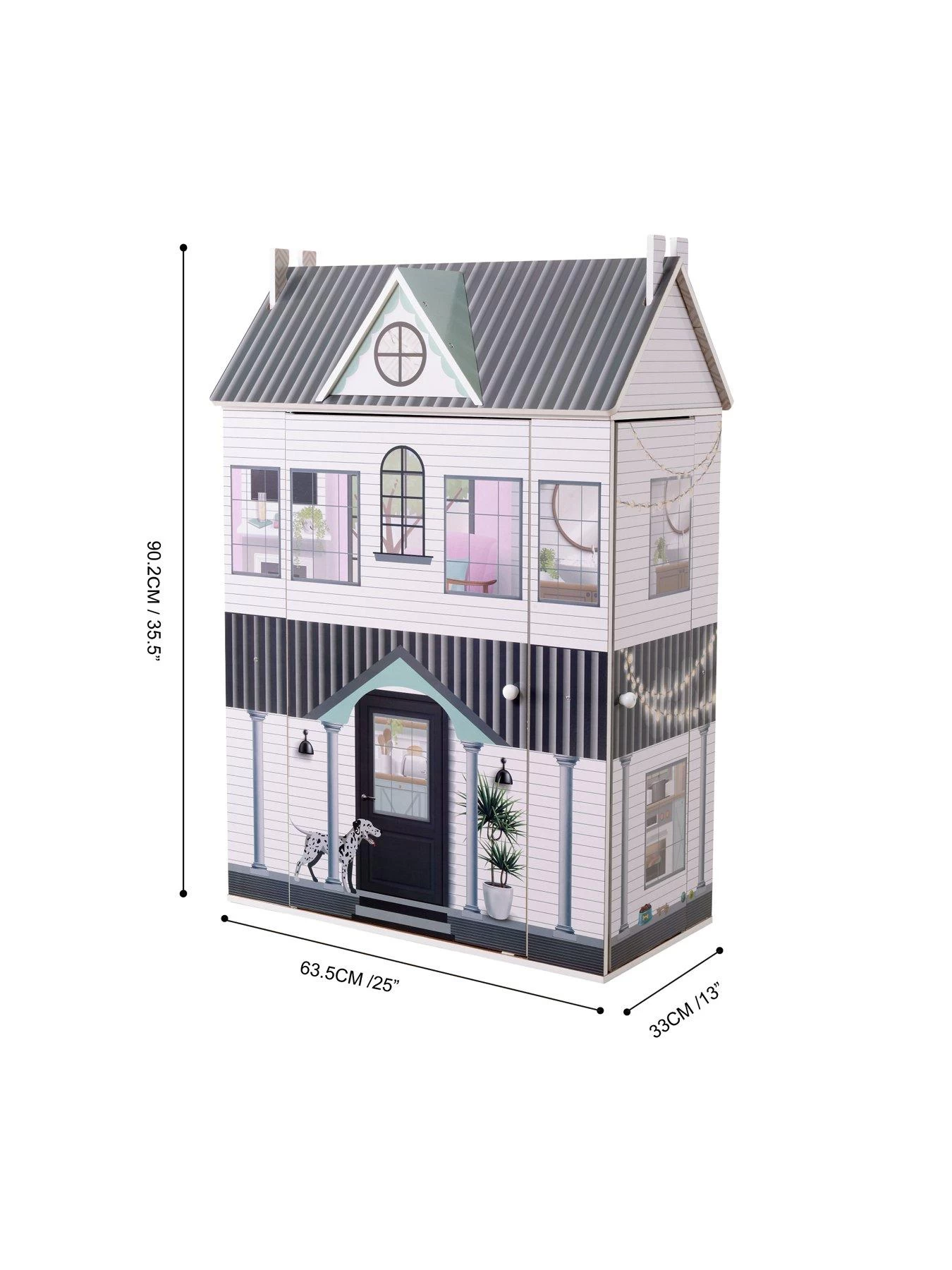 Standing at 90.2 cm tall this three story, statuesque doll house is brightly decorated throughout each room and include 13 accessories. The accessories include a bed with attached pillow, a sofa, a dining table with two chairs. Two rugs, a plant, a lounge chair, a floor lamp, a pendant light (which can be moved from room to room), a bathtub, and a toilet. Plus all the accessories can be moved from room to room, even the plant pot.