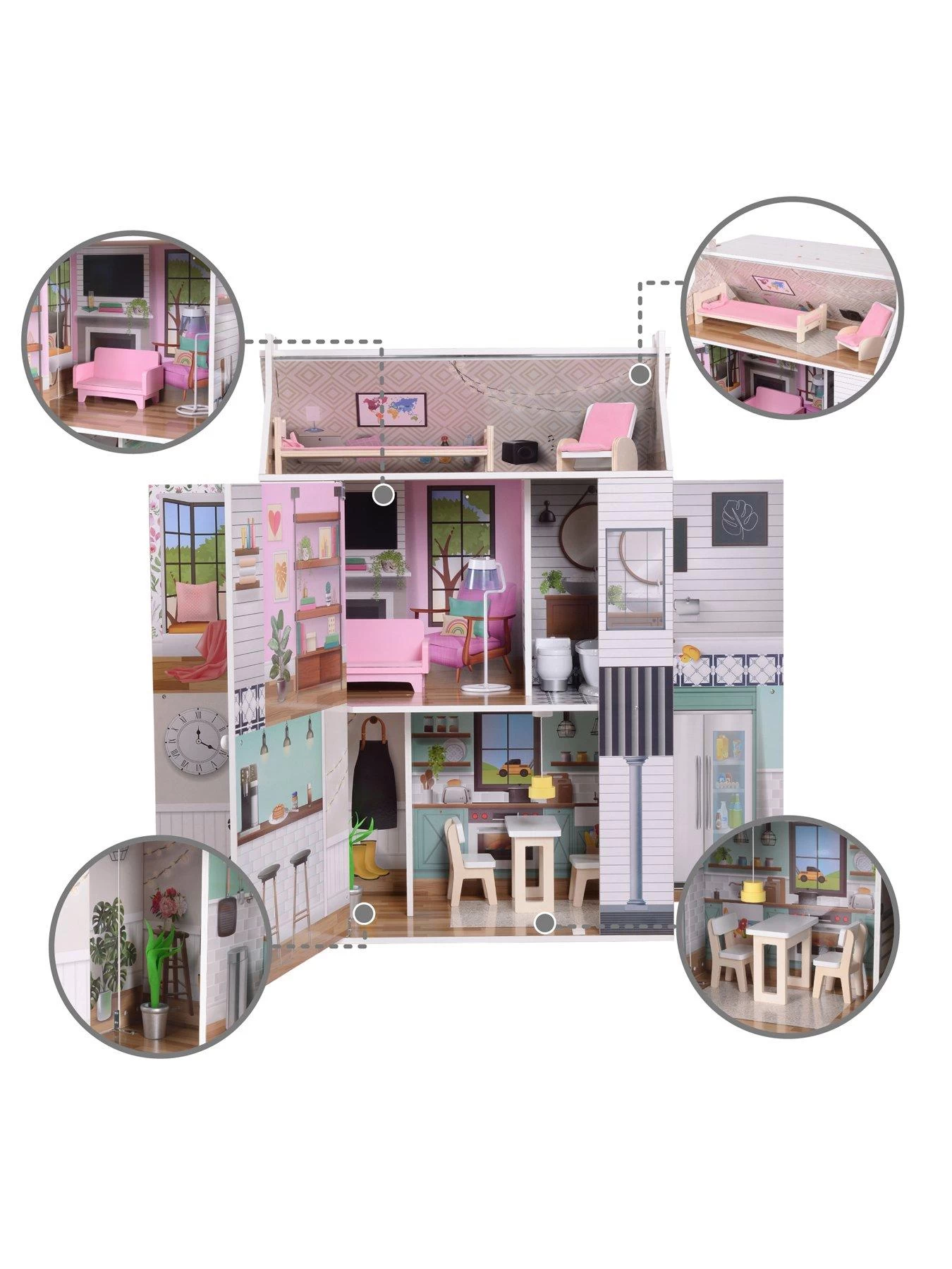 Let your child create their own world of imagination and role play with Teamson’s interactive three-sided wooden Farmhouse. This modern farmhouse-style dollhouse encourages 360 degree play due to the open sides and roof panel which allows access to all areas of the house including the rooftop deck, the kitchen area, living area, bedroom suite. The bathroom features a bathtub, and the toilet flushes resulting in a ‘flush’ sound effect!