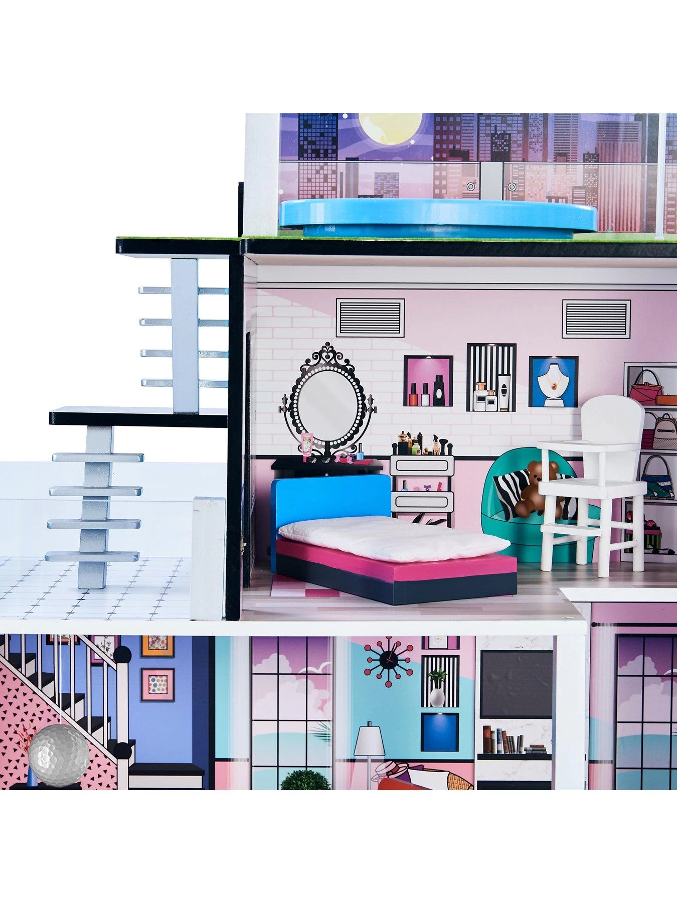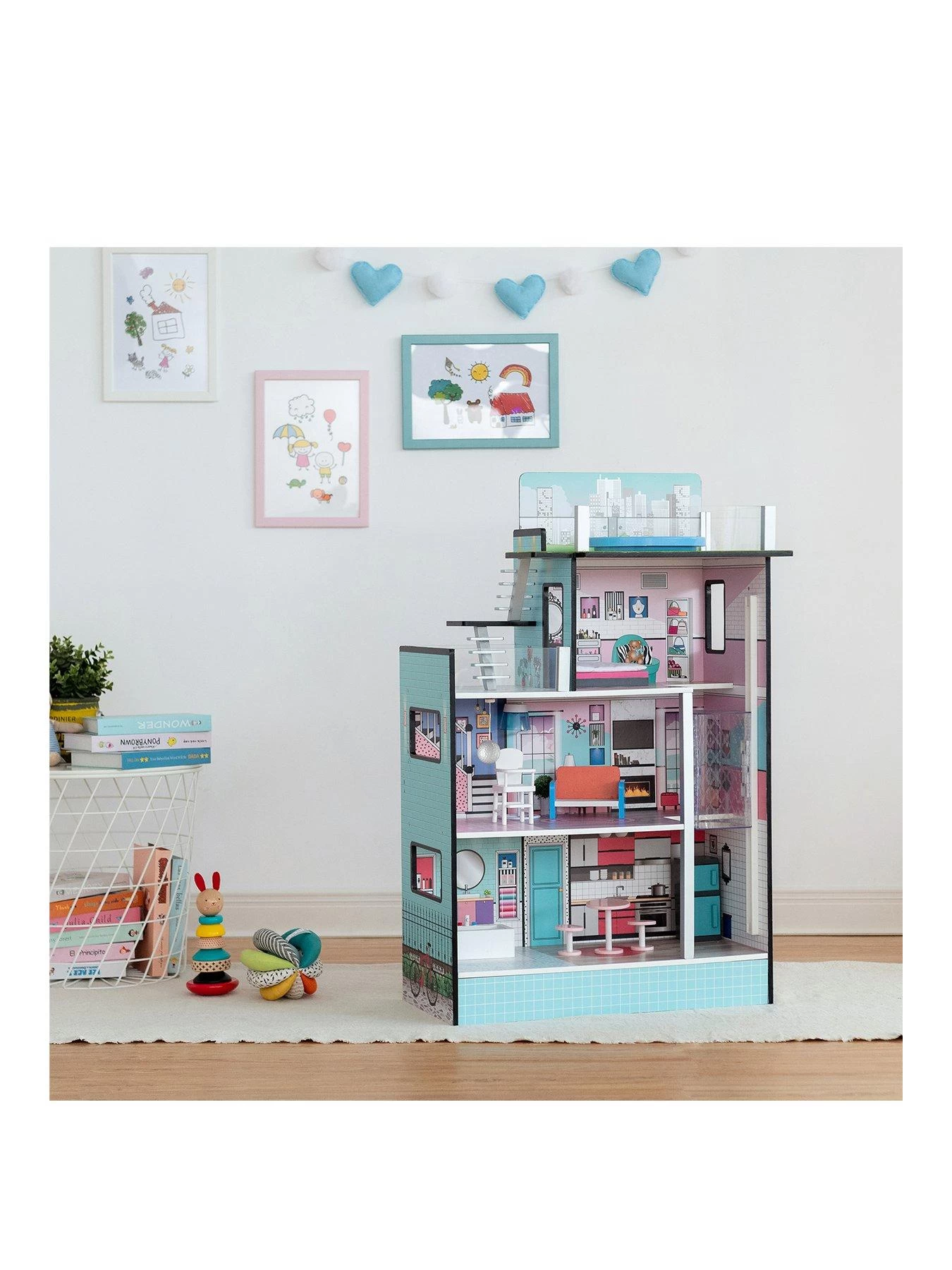 Our exquisite Dreamland Barcelona Doll House is everything you could want in a doll house. With a working elevator to transport your dolls up and down, a floor lamp that actually turns on as well as a top panel on the food that can be flipped between a day or a night view. The walls are very vivid and detailed, complete with pictures of furniture. Our dollhouse will ignite your little ones imagination and give them endless hours of fun. The role play involved with their dolls is a great way for them to improve their communication skills and to learn how to care for others. Crafted from high quality wood and MDF to ensure it has a very sturdy and durable framework.