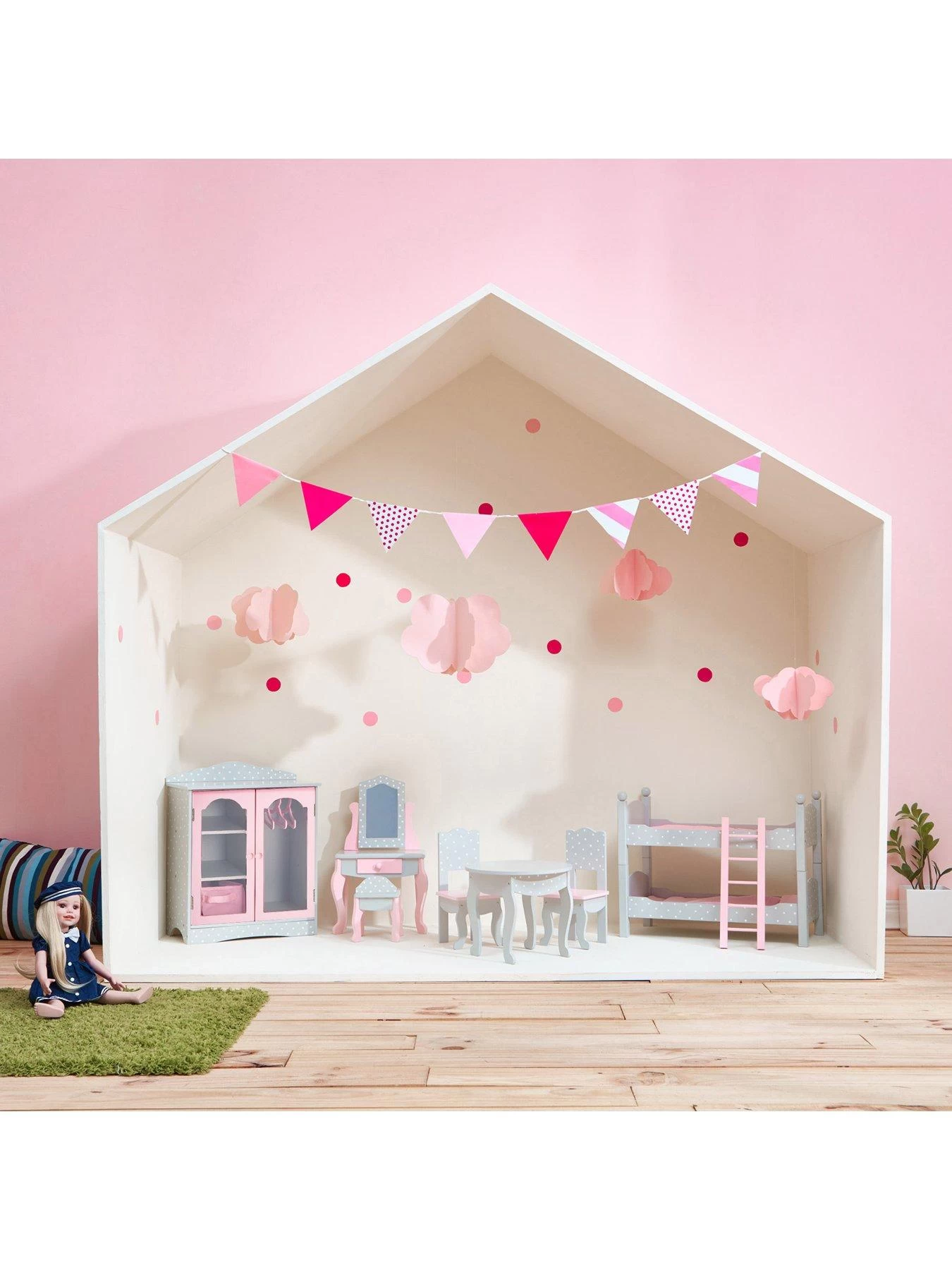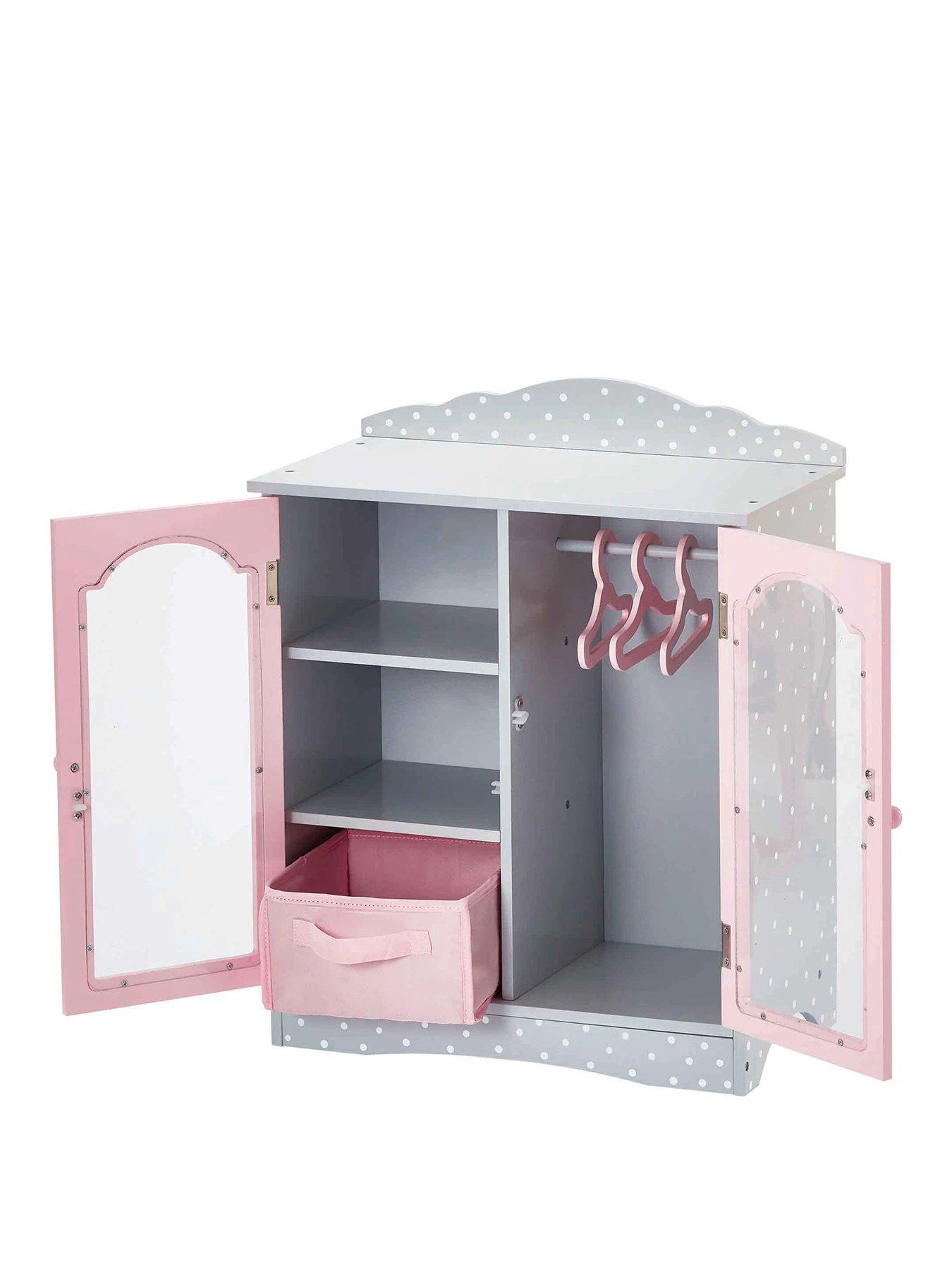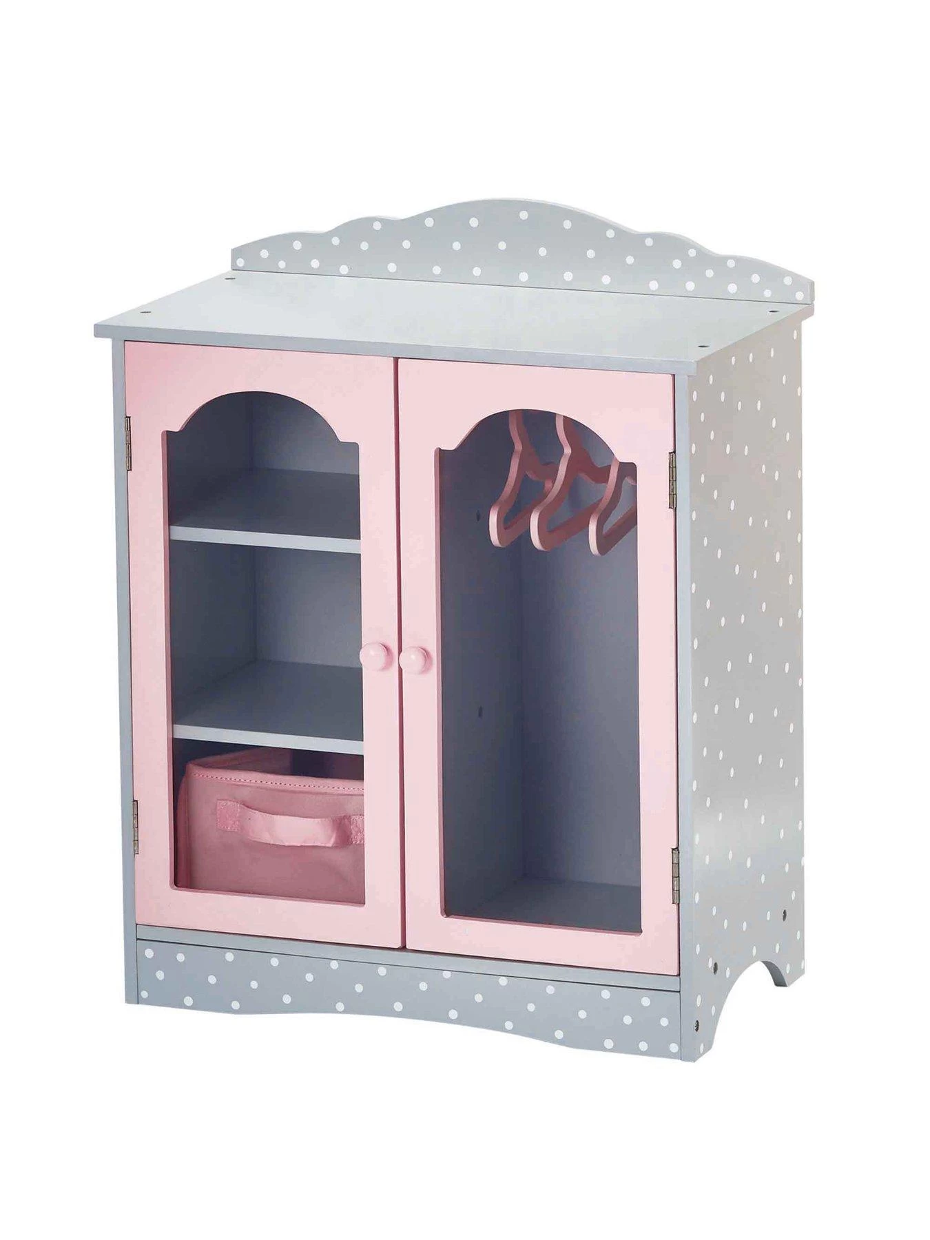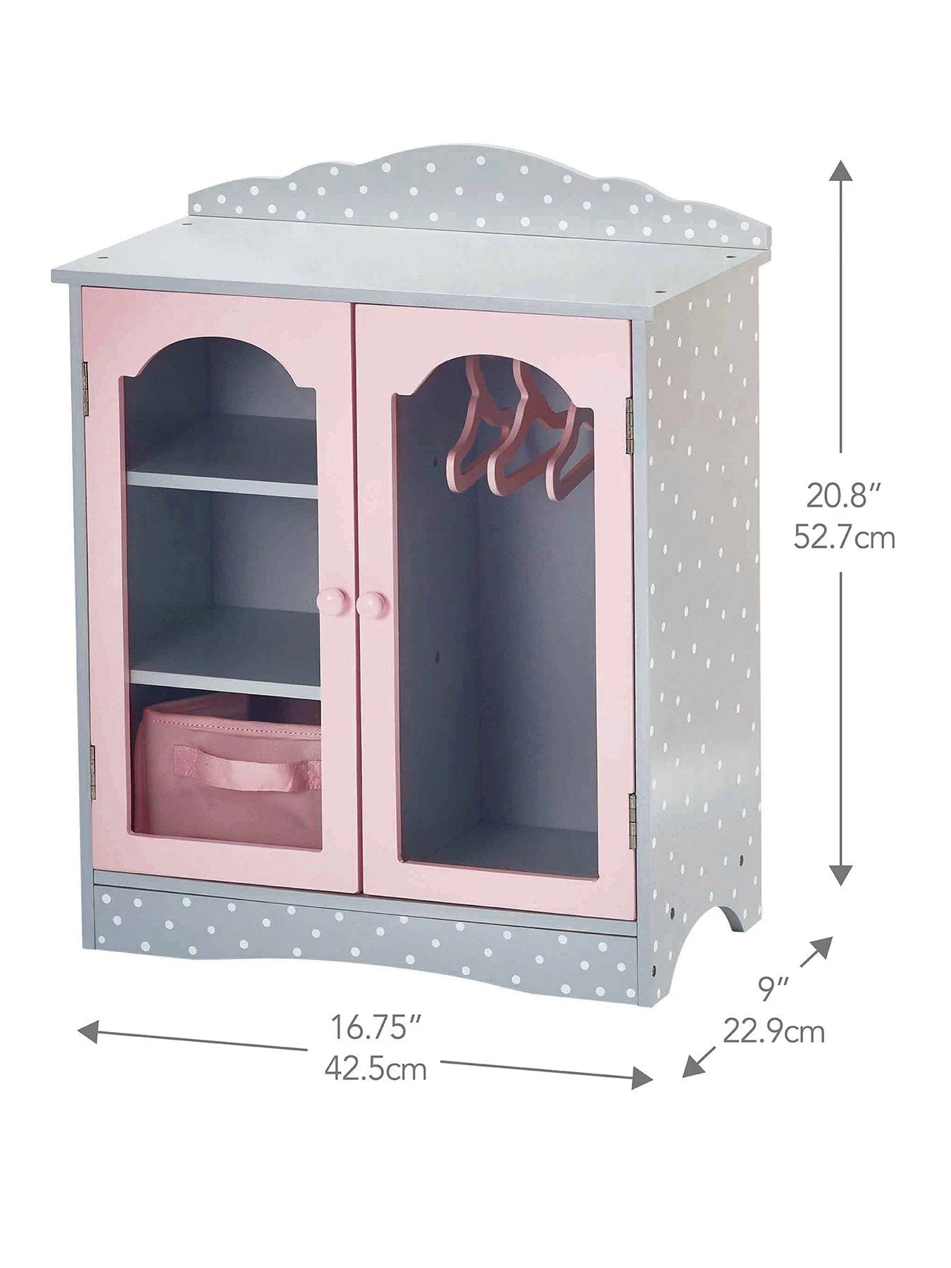 Give their favourite doll a special place to get dressed up with our cute pink and grey polka dot doll closet. The perfect addition to their doll furniture collection, our doll closet comes with 2 double doors, 1 drawer, 3 storage shelves and 3 high-quality hangers ideal for displaying their dolls favourite outfits and keeping them tidy when they’re not being played with. Crafted from high-quality, eco-friendly wood.