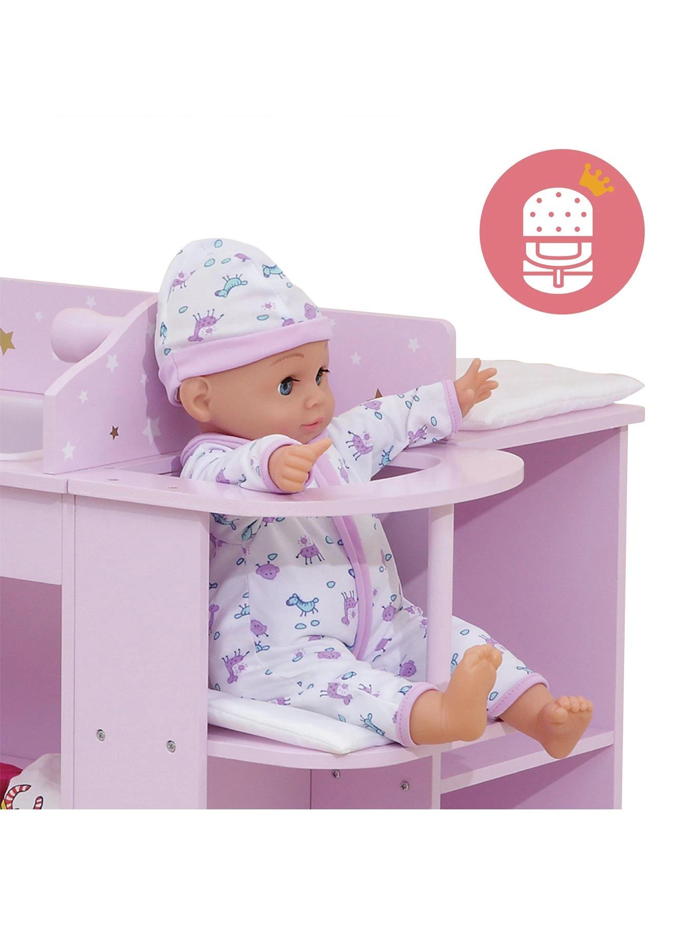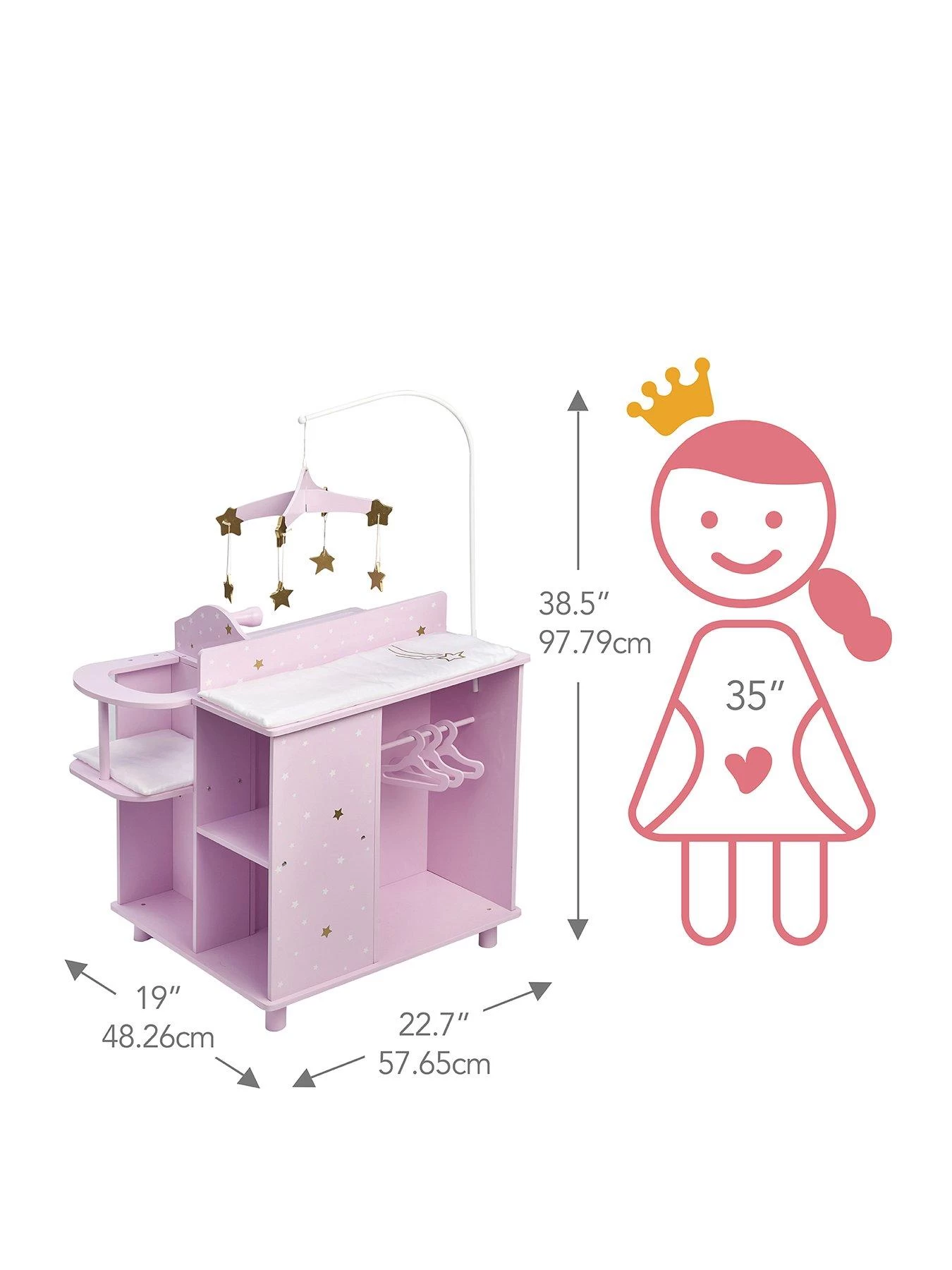 Add fun and functional furniture to your little one’s play area with the Olivia’s Little World Kids Twinkle Stars Princess Baby Doll Changing Station with Storage. This changing station has a bright pink finish with star accents for a decorative addition to your child’s bedroom or play area. This baby doll changing station includes a complete nursery station with a changing area, sink, high chair, and an overhead mobile for immersive play. Both sides of this free-standing dollhouse have versatile storage options, with shelving under the sink and high chair, and a roomy hanging area with 3 included hangers under the changing area. Made with eco-friendly MDF, this durable changing area is designed for long-lasting use and is easy to clean for convenient upkeep. This baby doll nursery station measures 22.75″ x 19″ x 38.5″ and is compatible for 16″ to 18″ dolls. The Olivia’s Little World Kids Twinkle Stars Princess Baby Doll Changing Station with Storage is designed for kids ages 3 years and up.