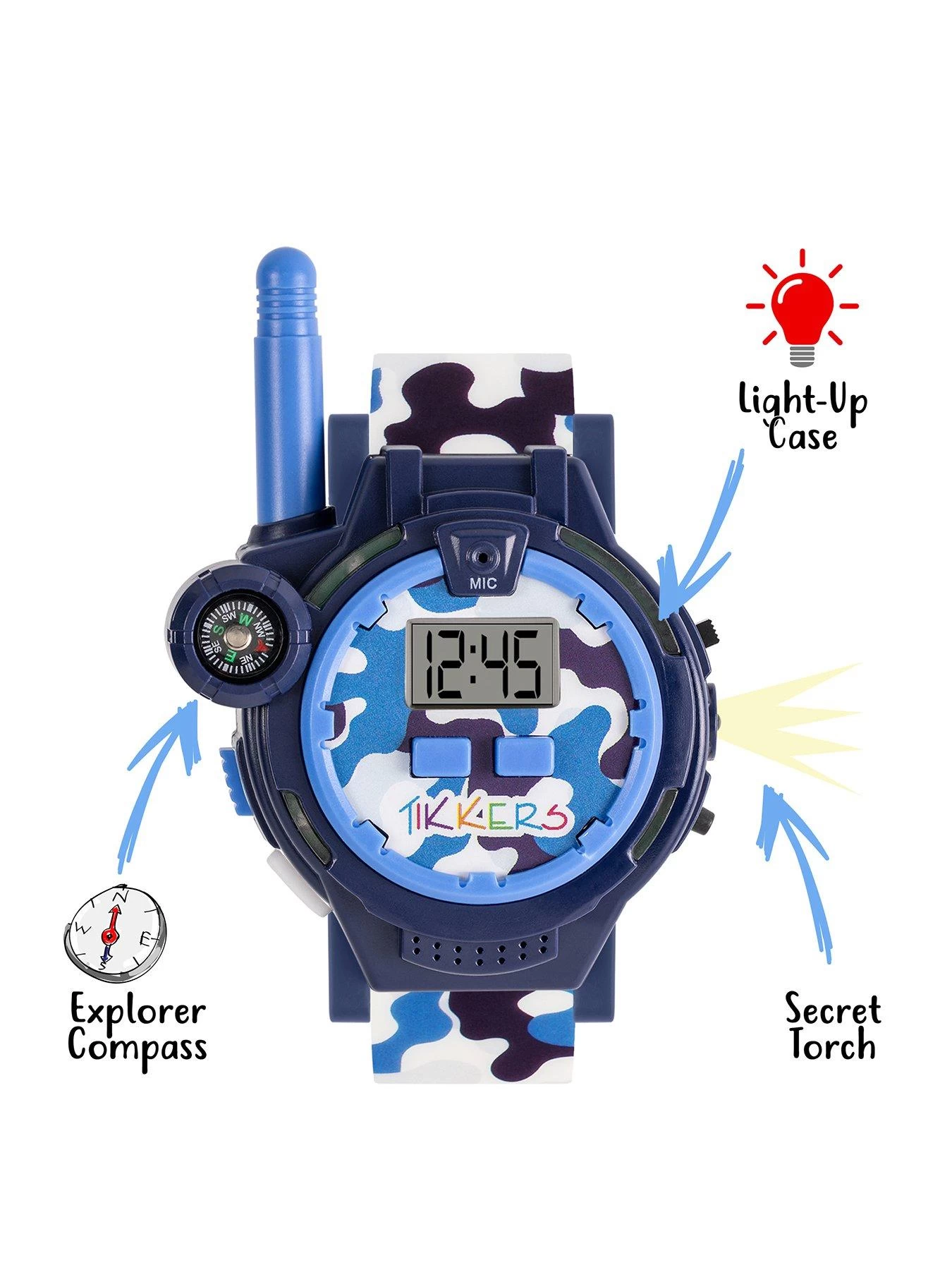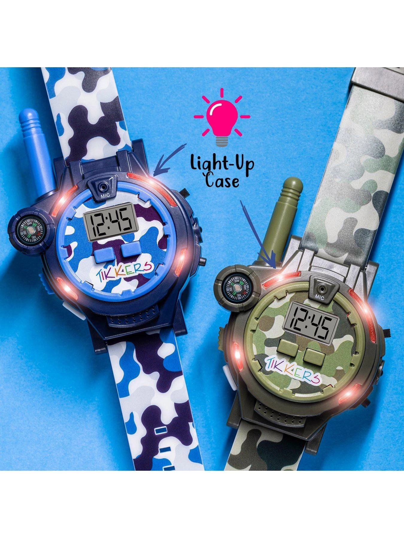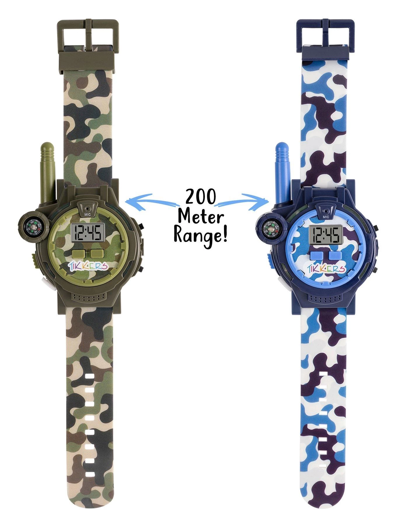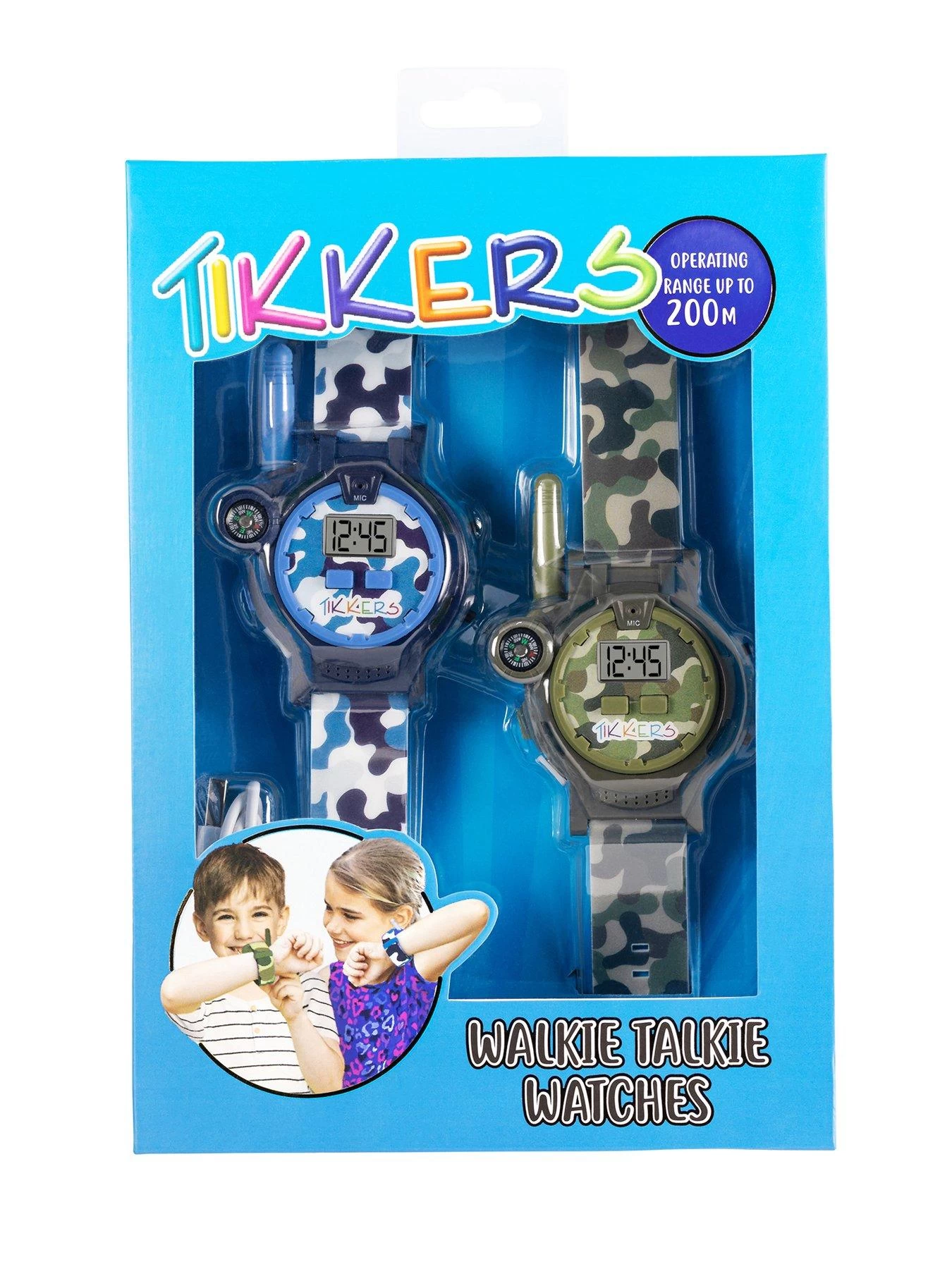 Tikkers Boys Blue and Green Walkie Talkie Watch Set. Featuring a set of 2 Blue and Green camo walkie talkie watches with digital time display and printed silicone straps. The watch includes a walkie talkie switch with light up case when turned on, flash light button, antenna, compass, clock adjustment button and talk button. Packaged in official branded Tikkers packaging and comes with one year guarantee.