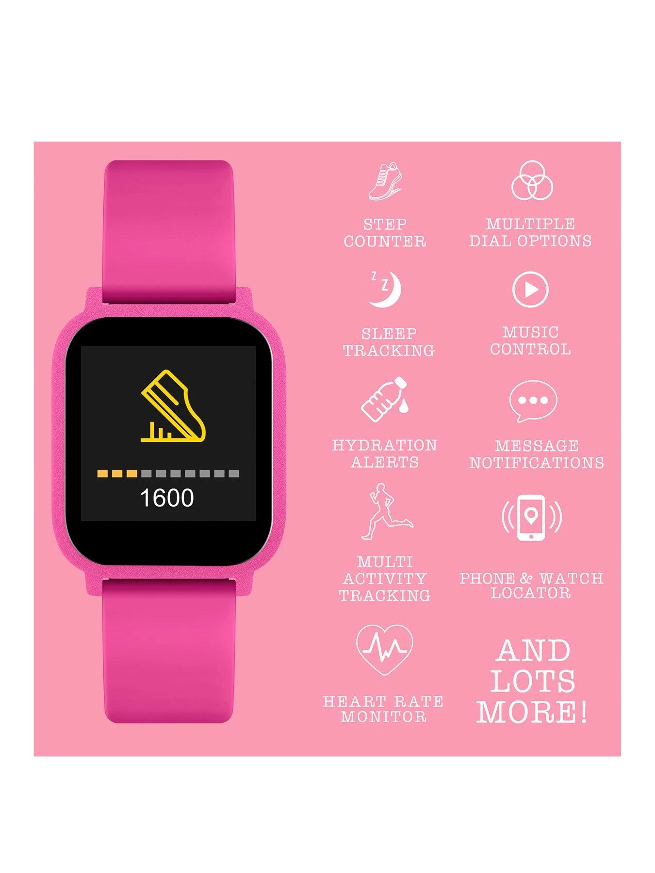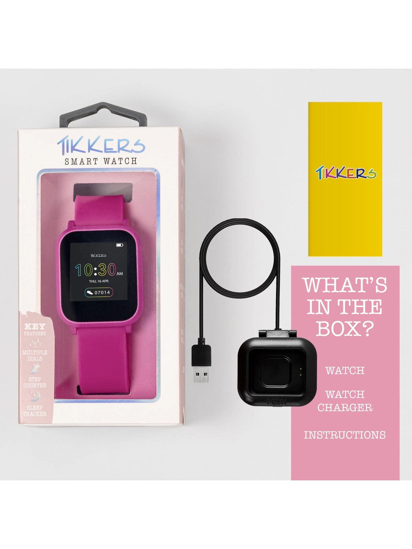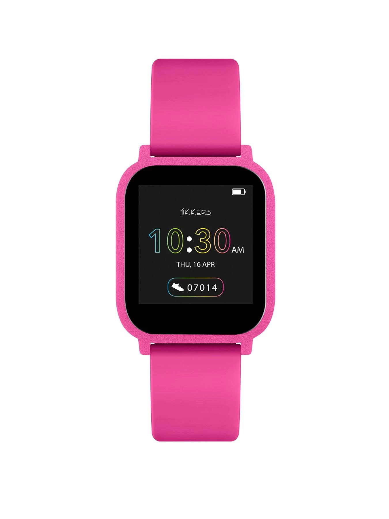 Introducing our brand new collection of Smartwatches, designed for older children & teens. Tikkers Series 10 smart watch with heart rate monitor, music control, colour touch screen and up to 7 day battery life. Features include: GPS function, receive message notifications, track specific activities (running/walking/cycling/climbing) in real time, distance and steps tracking, hydration and sedentary reminders, breathing exercises, live weather updates from your watch, selfie camera control, find your phone function, track your sleep, alarm and reminders. Rectangular Plastic pink case with matching silicone strap. Each watch is packed in a Tikkers gift box complete with instruction manual, USB charger (sealed rechargeable battery) and 1 year manufacturer guarantee. IP68 Water Resistant. Download the free Tikkers App now to explore in more detail. IOS & Android Compatible.