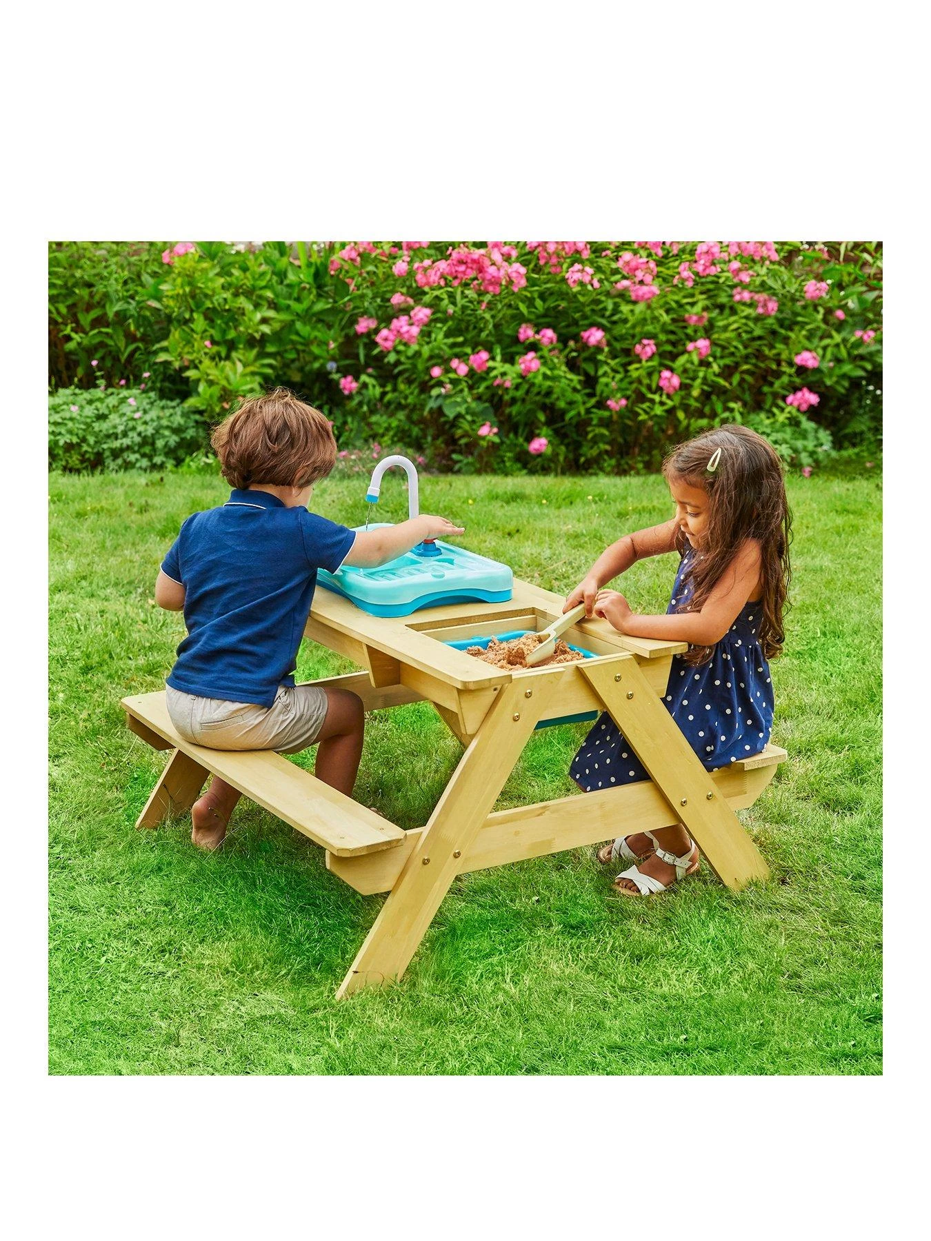 This picnic table is packed full of activities and is the perfect way for kids to enjoy active, sensory play (without making a mess in the house!). It has an in-built splash tub to fill with sand or their favourite finds in the garden and even a working sink!