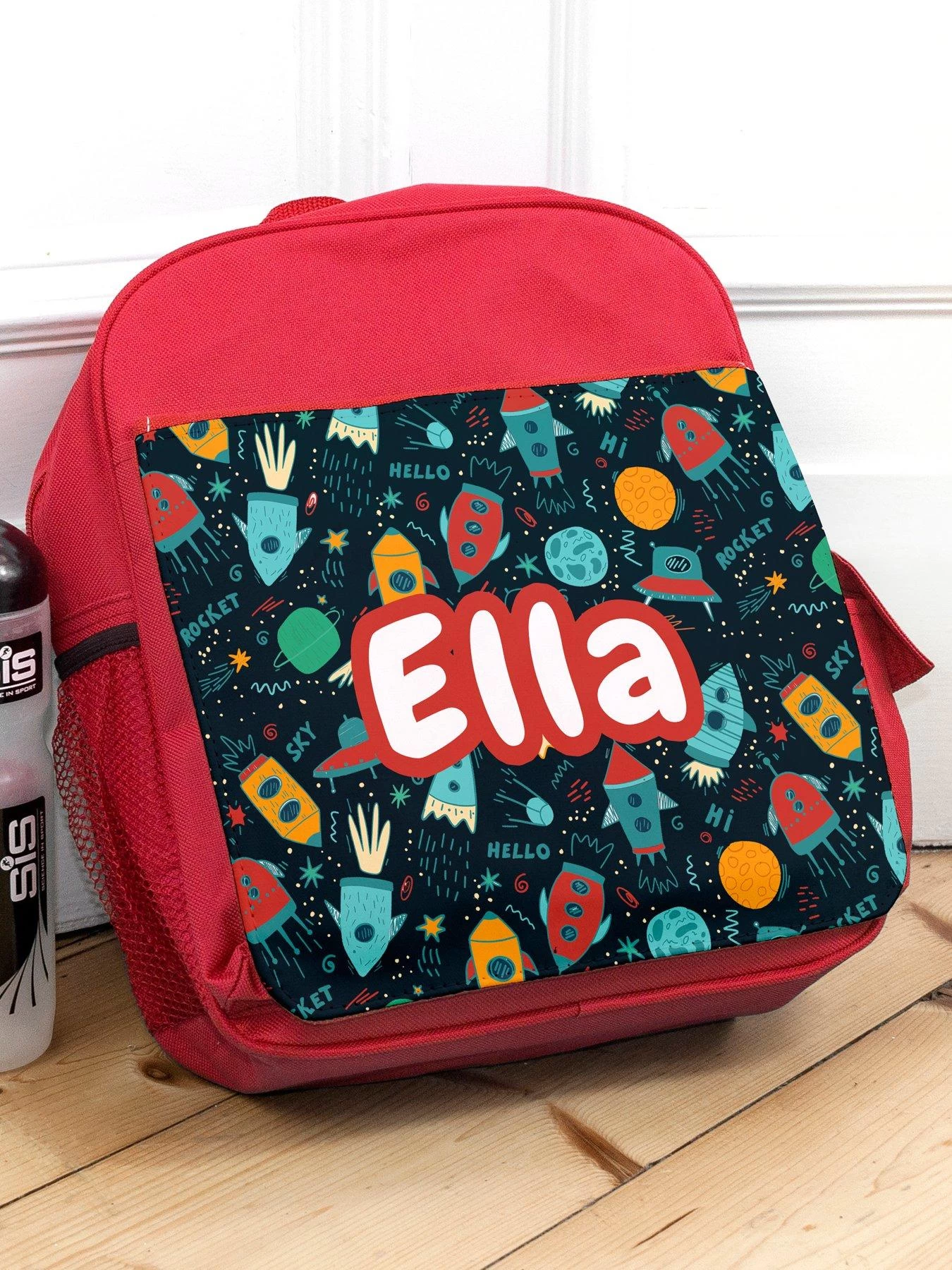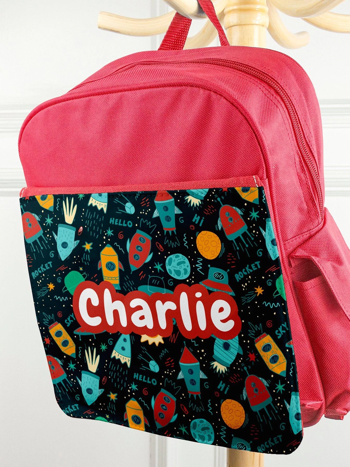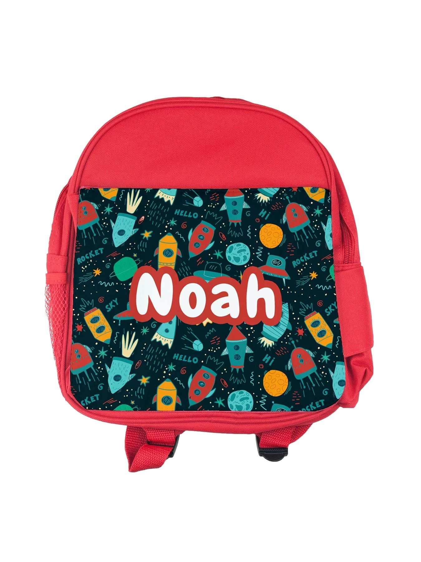 - A cute personalised kids backpack, featuring a fun space design, perfect for taking to school!